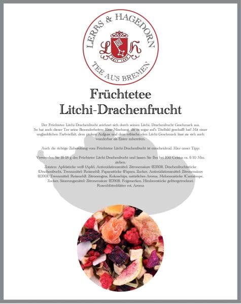 Dragon Fruit Lychee Tea is distinguished by its lychee and dragon fruit flavor. This tea also has its own unique characteristics: a blend that has even graced the cover of a magazine. With its incredible variety of colors, pink infusion, and refreshing lychee taste, it can also be prepared as iced tea. Proper preparation of Dragon Fruit Lychee Tea is crucial. Here's our tip: use 16 to 18 grams of Dragon Fruit Lychee Tea and steep it at approximately 100 C for 6 to 10 minutes. Ingredients: White apple pieces (apple, antioxidant: citric acid (E330)), dragon fruit pieces (dragon fruit, release agent: rice flour), papaya pieces (papaya, sugar, antioxidant: citric acid (E330), release agent: rice flour), lemongrass, coconut flakes, natural flavoring, melon pieces (cantaloupe, sugar, medium acid: citric acid (E330)), fig wedges, freeze-dried raspberry pieces, red rose petals, flavoringThé aux fruits du dragon Litchi 2 kgDESCRIPTION DU PRODUIT Le thé aux fruits Litchi au fruit du dragon se distingue par son litchi, son goût de fruit du dragon. Ainsi, ce thé a également ses particularités : un mélange qui a même réussi à être sur la couverture. Avec une incroyable variété de couleurs, l'infusion rose et le goût rafraîchissant de litchi, elle peut également être préparée comme thé glacé. La bonne préparation du thé aux fruits du dragon Litchi est également cruciale. Voici notre conseil : utilisez 16 à 18 g du thé aux fruits du dragon Litchi et laissez-le à 100 C environ 6 à 10 minutes. Ingrédients : morceaux de pomme blanche (pomme, antioxydant : acide citrique (E330), morceaux de fruit du dragon (fruit du dragon, agent de démoulage : farine de riz), morceaux de papaye (papaye, sucre, antioxydant : acide citrique (E330), agent de démoulage : farine de riz), citronnelle, copeaux de coco, arôme naturel, morceaux de melon (cantaloup, sucre, acidifiant moyen: acide citrique (E) 330)), coins de figues, morceaux de framboise lyophilisés, pétales de rose rouge, arôme