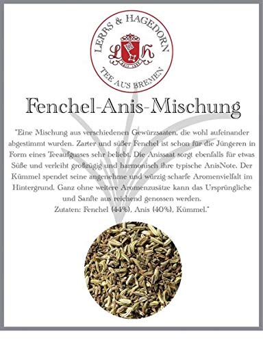 A blend of various spice seeds, carefully coordinated. The delicate, sweet fennel is already a favorite for young people when brewed as an infusion. The anise seed adds a touch of sweetness and generously and harmoniously imparts its characteristic aniseed note. Cumin diffuses its pleasant and spicy aroma in the background. Without any added flavorings, the original, mild fragrance can be fully appreciated. Ingredients: fennel (44 ), anise (40 ), cumin.