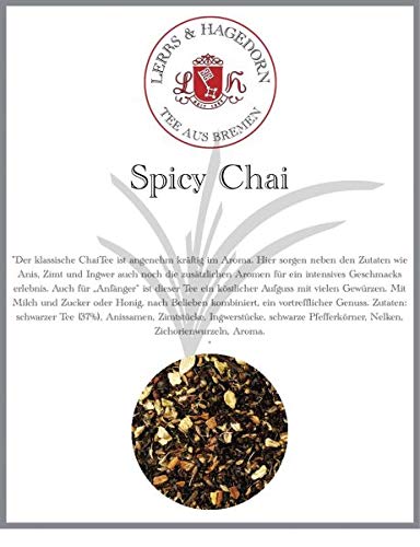 Classic Chai tea boasts a pleasantly robust aroma. In addition to ingredients like anise, cinnamon, and ginger, extra flavorings ensure an intense taste experience. Even for those new to tea, this is a delicious spiced infusion. Combined with milk and sugar or honey, as you prefer, it's a truly delightful treat. Ingredients: Black tea (37 ), anise seeds, cinnamon pieces, ginger pieces, black peppercorns, cloves, chicory root, flavoring.
