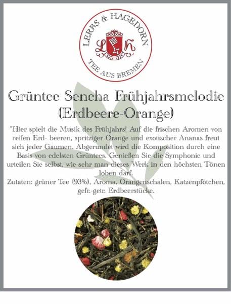 The music of spring plays here! Every palate delights in the fresh aromas of ripe strawberries, sparkling orange and exotic pineapple. The composition is rounded off by a base of noblest green tea. Enjoy the symphony and judge for yourself how much you can praise this work in the highest notes.Lerbs Hagedorn, Groene thee Sencha voorjaarsmelodie aardbeien sinaasappel ananas 1kg (ca. 81 liter) met sinaasappelschillen, kattenpootjes, aardbeien Hier speelt de muziek van het voorjaar! Op de frisse aroma's van rijpe aardbeien, sprankelende sinaasappel en exotische ananas verheugt elk gehemelte. De compositie wordt afgerond door een basis van edelste groene thee. Geniet van de symfonie en oordeel zelf hoeveel je dit werk in de hoogste tonen mag prijzen.