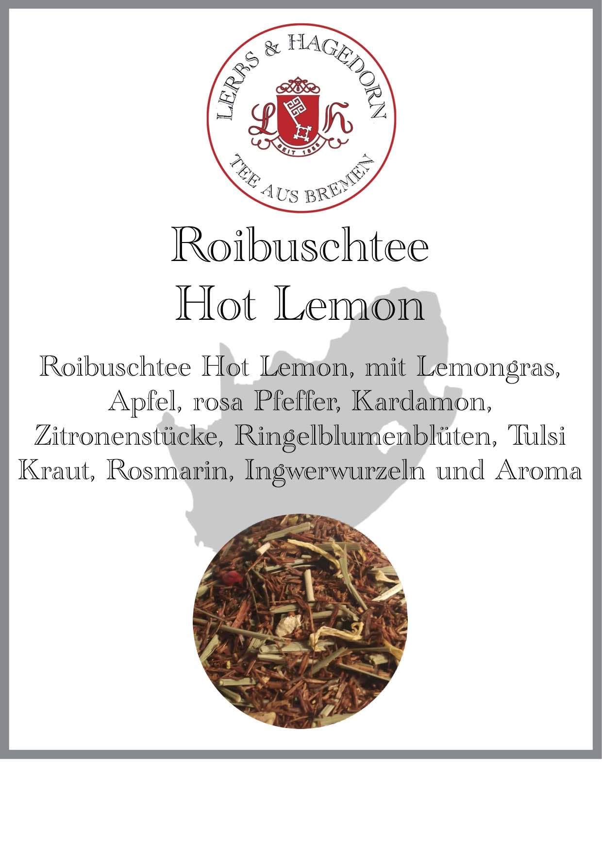 Hot Lemon Roobush Tea, with lemongrass, apple, pink peppercorns, cardamom, lemon pieces, calendula flowers, tulsi herb, rosemary, ginger root, and a flavor miracle. 1.5 kg package. To prepare hot lemon roobush tea, use 1 teaspoon of tea per cup. The optimal water temperature is 95-100 C, with 10-15 g of tea per 1 liter of water. Steeping for 5 minutes ensures a full aromatic experience. Roobush tea can generally be steeped longer without developing bitterness. Classic roobush tea is a delight both hot and cold, like iced tea. This Hot Lemon Roobush Tea from Lerbs Hagedorn is a truly heavenly refreshment. Combined with the freshest ingredients such as lemongrass, apple, pink peppercorns, cardamom, lemon segments, calendula flowers, tulsi herb, rosemary, and ginger root, along with the aroma of natural essential oils, this tea will bring you an unforgettable taste experience. Enjoy a warm cup of tea any time of day and let yourself be captivated by its lemony and aromatic scent. The distinctive taste and versatile combination of high-quality herbs make it a unique addition to any cup of tea. Simply add it to boiling water and savor it for a soothing sensation within and a feast for all the senses.Lerbs Hagedorn, Thé roibusch Hot Lemon 1,5 kg (environ 122 l) citronnelle, pomme, poivre rose, cardamone, morceaux de citronDESCRIPTION DU PRODUIT Thé roibusch Hot Lemon, avec citronnelle, pomme, poivre rose, cardamone, morceaux de citron, fleurs de calendula, herbe tulsi, romarin, racines de gingembre et arôme miracle de goût. Emballage de 1,5 kg. Préparation de thé au roibusch au citron chaud, 1 cuillère à café de thé par tasse. La température de l'eau optimale est de 95 à 100 C, 10 g à 15 g de thé par 1 l d'eau. Laisser infuser pendant 5 minutes assure une expérience aromatique complète. Le thé Roibusch peut généralement tirer plus longtemps sans développer de substances amères. Le thé roibusch classique chaud mais aussi froid que IceTea est un plaisir. Ce thé au roibusch Hot Lemon de Lerbs Hagedorn est un véritable rafraîchissement céleste. Combiné avec les ingrédients les plus frais tels que la citronnelle, la pomme, le poivre rose, la cardamone, les morceaux de citron, les fleurs de calendula, l'herbe de tulsi, le romarin et les racines de gingembre, ainsi que l'arôme des huiles essentielles naturelles, ce thé vous apportera une expérience gustative inoubliable. Savourez une tasse de thé chaud à tout moment de la journée et laissez-vous envoûter par son arôme citronné et aromatique. Le goût particulier et la combinaison polyvalente des herbes de haute qualité en font un ajout unique à n'importe quelle tasse à thé. Il suffit de le mettre dans de l'eau bouillante et de le savourer pour une sensation apaisante à l'intérieur et un festin pour tous les sens.