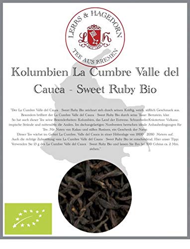 La Cumbre Valle del Cauca - Sweet Ruby Organic Black Tea is distinguished by its powerful, smooth, and sweet taste. The leaf can also be described as thin, leathery, and black. La Cumbre Valle del Cauca - Sweet Ruby Organic Black Tea is particularly striking in its amber and clear cup color. This tea also has its own unique characteristics: in the jungle-covered Andes Mountains of Colombia, constant rainfall and fertile soils provide ideal conditions for tea cultivation. Hand-picked and finely rolled, this tea offers notes of cocoa and sweet raisins. A gift from nature. This tea grows in the La Cumbre region of Valle del Cauca at an altitude of 1800-2050 meters. Proper preparation of La Cumbre Valle del Cauca - Sweet Ruby Organic Black Tea is also essential. Here's our tip: use 13g of La Cumbre Valle del Cauca Organic Sweet Ruby black tea and brew at 100 C for about 2 minutes. Valle del Cauca, located in the tropical west of Colombia, offers ideal growing conditions for these expressive and slightly sweet teas. Small, repeatedly twisted leaves with notes of cocoa and sweet raisins. A gift from nature.Lerbs Hagedorn, Thé noir La Cumbre Valle del Cauca - Sweet Ruby Bio Puissant, doux, sucré 1 kg env. (81 litres)DESCRIPTION DU PRODUIT Le thé noir La Cumbre Valle del Cauca - Sweet Ruby Bio se distingue par son goût puissant, doux, sucré. La feuille peut également être décrite comme: fine, coriace, noire. Le thé noir La Cumbre Valle del Cauca - Sweet Ruby Bio brille particulièrement par sa tasse : ambre, clair. Ainsi, ce thé a également ses particularités : dans les Andes de Colombie, couvertes par la jungle, les précipitations constantes et les sols fertiles offrent des conditions idéales pour la culture du thé. cueilli à la main et finement roulé, ce thé se présente avec des notes de cacao et de raisins secs sucrés. Un cadeau de la nature. Ce thé pousse dans la région de La Cumbre, Valle del Cauca à une altitude de 1800 - 2050 mètres. La bonne préparation du thé noir La Cumbre Valle del Cauca - Sweet Ruby Bio est également essentielle. Voici notre conseil : utilisez 13 g de thé noir La Cumbre Valle del Cauca - Sweet Ruby Bio et laisser à 100 C environ 2 min. tirer. Valle del Cauca, situé dans l'ouest tropical de Colombie, offre des conditions de culture idéales pour ces thés expressifs et légèrement sucrés. Petite feuille torsadée plusieurs fois avec des notes de cacao et de raisins secs sucrés. Un cadeau de la nature