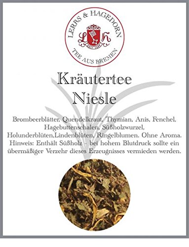 Niesle Herbal Tea with blackberry leaves, medendel, thyme, anise, fennel, rosehip, licorice, elderflower, linden, and calendula. Unflavored. Packaging unit: 250g. Preparation: Niesle Herbal Tea, 1 teaspoon of tea per cup. Be sure to pour the tea with freshly boiled, sparkling water. This is the only way to ensure safe preparation. 10g to 15g of tea per 1 liter of water. Allowing it to steep for 6 minutes ensures a full aromatic experience. Discover Niesle Herbal Tea from Lerbs Hagedorn – a perfect blend of natural ingredients that offer you an unparalleled taste experience. This tea contains a unique combination of blackberry leaves, thyme, anise, fennel, rosehip, licorice, elderflower, and linden, all without artificial flavorings. Enjoy this delicious tea at any time of day and let yourself be captivated by its unique blend of aromatic herbs. Try Lerbs Hagedorn Niesle herbal tea now and discover the many benefits of this natural beverage.Lerbs Hagedorn, Niesle Tisane 250 g (env. 21 litres) feuilles de mûrier, thym, anis, fenouil, cynorrhodon, réglisseDESCRIPTION DU PRODUIT Tisane Niesle aux feuilles de mûre, médendel, thym, anis, fenouil, cynorrhodon, réglisse, fleurs de sureau, tilleul, calendula. Sans arôme. Unité d'emballage « 250 g » Préparation de « Niesle » Thé aux herbes, 1 cuillère à café de thé par tasse. Assurez-vous de verser le thé avec de l'eau bouillante pétillante. C'est la seule façon d'obtenir un aliment sûr. 10 g à 15 g de thé par 1 l d'eau. Laisser infuser 6 minutes assure une expérience aromatique complète. Découvrez la tisane Niesle de Lerbs Hagedorn – un mélange parfait d'ingrédients naturels qui vous offrent une expérience gustative incomparable. Ce thé contient une combinaison unique de feuilles de mûre, de thym, d'anis, de fenouil, d'églantier, de réglisse, de fleurs de sureau et de tilleul, le tout sans arômes artificiels. Savourez ce délicieux thé à tout moment de la journée et laissez-vous envoûter par son mélange unique d'herbes aromatiques. Essayez dès maintenant la tisane Lerbs Hagedorn Niesle et découvrez les nombreux avantages de cette boisson naturelle