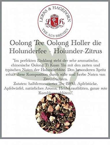 The highly aromatic, Chinese Oolong Ti Kuan Yin is in perfect harmony with the delicate and typical notes of elderflower. The special spray gets this composition from sweet and sweet notes of citrus fruits.Lerbs Hagedorn, Oolong Thee Oolong Holler de Holunderfee 1kg (ca. 81 liter) met stukjes appel, heide, korenbloem De zeer aromatische, Chinese Oolong Ti Kuan Yin is perfect in overeenstemming met de delicate en typische noten van vlierbloesem. De bijzondere spray krijgt deze samenstelling door zoete en zoete noten van citrusvruchten.