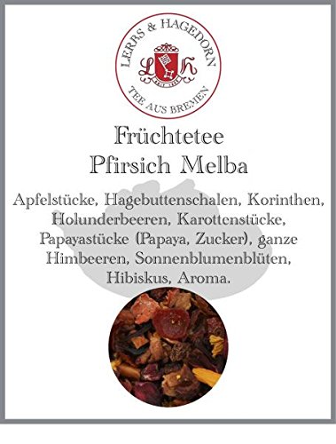 "Let yourself go – Peach Melba in your cup. With this tea, you can feel like summer is here. The aroma of peach Melba enhances your joie de vivre and allows you to enjoy the day even more. Besides the delicious peach aroma, you'll find other treats, such as apple pieces and currants. Elderberries work their magic, and carrot pieces are also a welcome addition. There's something special here! And something exotic like papaya is also on hand to promote your well-being. Enjoy this blend. Ingredients: potatoes, rosehip peels, currants, elderberries, carrot pieces, papaya pieces (papaya, sugar), raspberries, sunflower flowers, hibiscus, flavoring."Lerbs Hagedorn, Thé aux fruits de la pêche Melba 1 kg (environ 50 litres), morceaux de pomme, de cynornorrhodon, de corinthes, de baies de sureau, de carottesDESCRIPTION DU PRODUIT « Laissez-vous aller bien – Pêche Melba de la tasse. Avec ce thé, vous pouvez penser que l'été est là. L'arôme de pêche Melba augmente la joie de vivre et vous permet de profiter encore plus de la journée. Outre le délicieux arôme de pêche, vous attendez d'autres friandises, comme des morceaux de pommes et des corinthes. Les baies de sureau laissent jouer leur charme et les morceaux de carotte sont également volontiers parties. Il y a quelque chose ! Mais aussi exotique comme la papaye est également avec vous quand il s'agit de promouvoir vous et votre bien-être. Amusez-vous bien avec ce mélange. Ingrédients : pommes de terre, écorces de cynorrhodon, corinthe, baies de sureau, morceaux de carotte, morceaux de papaye (papaye, sucre), framboises, fleurs de tournesol, hibiscus, arôme.