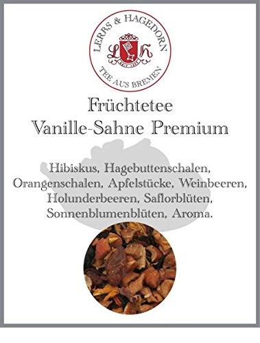 Fruit Tea with a Sweet Vanilla and Cream Flavor - This aromatic fruit tea, made with hibiscus, peel, and orange, has a special appeal. The slightly caramelized taste of the cream and the familiar vanilla notes found in sweet dishes meet the red berries. These elements combine to create a special tea experience with every cup of this premium tea. Even during brewing, you'll notice the wonderfully vanilla notes and the tea's intense red color. Its fruity and slightly sweet taste pairs particularly well with cakes and pastries. Whether enjoyed as a breakfast tea or by children, this vanilla tea is sure to please both adults and children. Ingredients: hibiscus, hibiscus peel, orange peel, apple pieces, wineberries, elderberries, safloral flowers, sunflower flowers, flavoring.Lerbs Hagedorn, Thé aux fruits à la vanille Sahne Premium 1 kg (environ 50 litres) d'hibiscus, de cynorrhodon, de bols d'orangeDESCRIPTION DU PRODUIT Thé aux fruits au goût doux de vanille et de crème - Ce thé aromatique aux fruits à base d'hibiscus, d'écorce et d'orange, a un atout particulier. Le goût légèrement caramel de la crème et les notes de vanille connues dans les plats sucrés rencontrent les fruits rouges. Ils font des ingrédients fruités de ce thé haut de gamme avec chaque tasse une expérience de thé spéciale. Déjà au moment de l'infusion, vous remarquerez les notes merveilleusement vanillées et la couleur rouge intense de ce thé. Son goût fruité et légèrement sucré se marie particulièrement bien avec les gâteaux et pâtisseries. En tant que thé de petit déjeuner ou pour les petits buveurs de thé, ce thé à la vanille séduit aussi bien les grands que petits. Ingrédients : hibiscus, écorce de la lunette, écorce d'orange, morceaux de pomme, baies de vin, baies de sureau, fleurs de safloral, fleurs de tournesol, arôme.