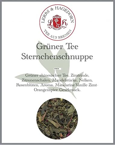 Like a shooting star, this Chinese green tea dazzles us, yet leaves nothing to be desired! Make a wish. This green tea, cultivated in China, is as delicate as a shooting star: traditional green tea is combined with cinnamon bark, lemon peel, almond pieces, cloves, and rose petals. The unique feature of this tea is its mandarin-vanilla-cinnamon-orange spice aroma. Savor a cup of this delicious tea and feel the fire of a shooting star. You will feel at ease, as this special tea meets all your needs. And so that you can enjoy this pleasure again and again, we offer Shooting Star Tea in several loose-leaf packs. Ingredients: Chinese green tea, cinnamon bark, lemon peel, almond pieces, cloves, rose petals, flavoring. Mandarin-orange-vanilla-cinnamon spice flavor.Lerbs Hagedorn, Thé vert étoiles filantes Épice mandarine-vanille-cannelle-orange saveur 250 g (environ 20 litres) écorce de cannelle, zeste de citronDESCRIPTION DU PRODUIT Comme une étoile filante, ce thé vert chinois nous étonne, mais ne laisse rien à désir! Faites un vœu. Ce thé vert, cultivé en Chine, est aussi tendre qu'un astérisque filant : le thé vert traditionnel est associé à l'écorce de cannelle, aux écorces de citron et aux morceaux d'amande, aux clous de girofle et aux pétales de rose. La particularité de ce thé est l'arôme mandarine - vanille - cannelle - épice orange. Savourez une tasse de ce délicieux thé et sentez le feu d'une étoile filante. Vous vous sentirez à l'aise, car ce thé spécial répond à tous vos besoins. Et pour que vous puissiez profiter de ce plaisir encore et encore, nous vous proposons le thé étoilé filant en plusieurs paquets en vrac. Ingrédients: Thé vert chinois, écorce de cannelle, zeste de citron, morceaux d'amande, clous de girofle, pétales de rose, arôme. Saveur d'épices à l'orange à la mandarine vanille-cannelle.