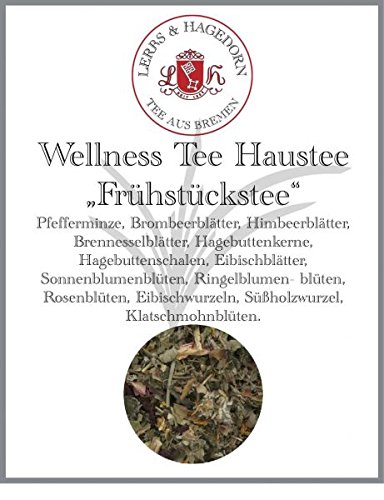 The day starts well: Breakfast Tea. This blend embodies the sunshine, reflected in its ingredients even on rainy days. Just imagine how peppermint mingles with a blackberry bush, punctuated by raspberries and a refreshing nettle. It's an encounter that is echoed in the aroma in multiple ways. And—Action! Rosehips, sunflowers, and marigolds also play a role in this colorful blend. The delicate rose also helps to awaken you with the tea's fragrance. Now you need to know what's in the tea. This blend is sure to help you start your day with a smile. Ingredients: Peppermint, blackberry leaves, raspberry leaves, nettle leaves, rosehip seeds, rosehip peels, owl leaves, sunflower petals, marigold flowers, rose petals, eggplant root, licorice root, poppy flowers.Lerbs Hagedorn, Wellness Tee Thé pour petit-déjeuner 1 kg (environ 71 litres), menthe poivrée, feuilles de mûre, feuilles de framboise, feuilles d'ortieDESCRIPTION DU PRODUIT La journée commence bien : le thé du petit-déjeuner Dans ce mélange se trouve le soleil, qui se reflète dans les ingrédients même les jours de pluie. Imaginez simplement comment la menthe poivrée se réunit avec un buisson de mûre, piquez les framboises et l'ortie très cool. C'est un encounter, qui se répète dans l'arôme de manière multiple. Et - Action ! Les cynorhodons, les tournesols et les souci jouent également un rôle dans ce mélange coloré. La rose délicate contribue également à vous réveiller par le parfum du thé. Désormais, vous devez savoir ce qui reste dans le thé. Ce mélange est certainement un mélange qui vous aidera à vous réjouir de la journée. Ingrédients : menthe poivrée, feuilles de mûre, feuilles de framboise, feuilles d'ortie, graines d'églantier, écorces de cynorrhodon, feuilles de chouette, pétales de tournesol, fleurs de souci, pétales de rose, racines d'œuf, racine de réglisse, fleurs de coquelicot.