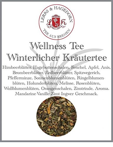 A warm, wintery infusion is like a balm for the soul, especially during the cold season when you need warmth, comfort, rest, and relaxation. A good cup of Wellnesstein tea is just the thing. With this winter teapot, you can enjoy a warm and soothing tea blend with a wonderful taste of berries, herbs, and spices. A harmonious blend for your well-being: The carefully selected and harmoniously chosen ingredients create a delicious blend that characterizes this excellent infusion. The aromatic scent of vanilla, cinnamon, and orange alone awakens the desire to enjoy a cup of tea in a relaxing atmosphere. Ingredients: raspberry leaves, rosehip peel, fennel, apple, anise, blackberry leaves, strawberry leaves, grape seeds, peppermint, sunflower, marigold flowers, elderflower, lemon balm, rose petals, wool petals, orange peel, flavoring. Taste of ginger, mandarin, vanilla, cinnamon.Lerbs Hagedorn, Wellness Thé aux herbes d'hiver Mandarine vanille et gingembre au gingembre 1 kg (environ 71 litres) Feuilles de framboiseDESCRIPTION DU PRODUIT Infusion chaude et hivernale comme baume pour l'âme, particulièrement pendant la saison froide, le besoin de chaleur et de confort, de repos et de détente. C'est exactement alors une bonne tasse de thé Wellnesstein comme un baume pour l'âme. Avec cette théière d'hiver, vous profitez d'un mélange de thé chaud et apaisant qui a un goût merveilleux de baies, herbes et épices. Composition harmonieuse pour votre bien-être Les ingrédients soigneusement sélectionnés et harmonieusement sélectionnés donnent une composition gourmande qui caractérise cette excellente infusion. Rien que le parfum aromatique de vanille, de cannelle et d'orange éveille l'envie de déguster une tasse de thé dans une atmosphère relaxante. Ingrédients : feuilles de framboise, écorce de cynorrhodon, fenouil, pomme, anis, feuilles de mûre, feuilles de fraise, pépins de pépin, menthe poivrée, tournesol, fleurs de souci, fleurs de sureau, mélisse, pétales de rose, pétales de laine, écorce d'oranger, arôme. Goût de gingembre mandarine, vanille, cannelle.