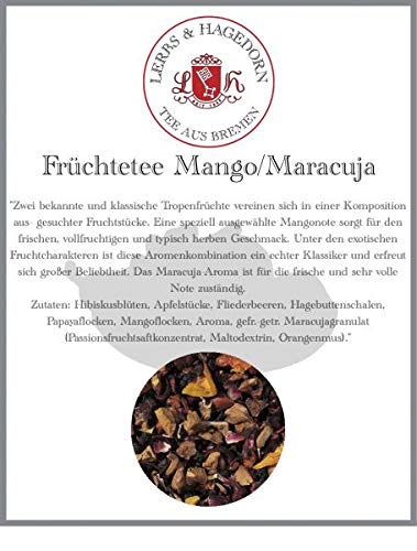 Two well-known and classic tropical fruits are combined in this blend of selected fruit pieces. A specially selected mango ensures a fresh, fruity, and typically joyous taste. Among exotic flavors, this combination is a true classic and enjoys great popularity. The passion fruit aroma provides a fresh and very full note. Ingredients: hibiscus flowers, apple pieces, lilac berries, rosehip peels, papaya flakes, mango, flavoring, freshness. Passion fruit granules (passion fruit juice concentrate, maltodextrin, orange musk).