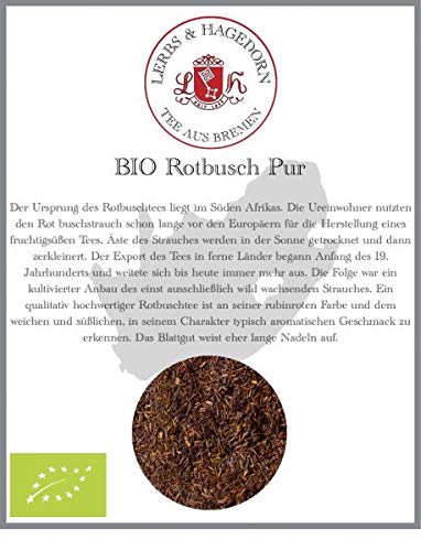 DESCRIPTION DU PRODUIT L'origine du thé à la buche rouge est située dans le sud de l'Afrique. Les indigènes ont utilisé le buisson rouge depuis longtemps avant les Européens pour la fabrication d'un thé fruité et sucré. Les branches du bouquet sont séchées au soleil puis broyées. L'exportation du thé vers des pays lointains a commencé au début du XIXe siècle et s'étendait de plus en plus jusqu'à aujourd'hui. Il en résulte une culture cultivée de l'arbuste qui pousse autrefois exclusivement sauvage. Un thé rouge de haute qualité se distingue par sa couleur rouge rubis et son goût doux et sucré, typique de son caractère. Les feuilles ont des aiguilles plutôt longues.
