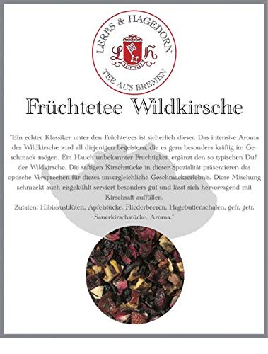 This is undoubtedly a true classic among fruit teas. The intense aroma of wild cherry will delight anyone who appreciates a particularly robust flavor. A hint of other, lesser-known fruit complements the typical wild cherry fragrance. The juicy cherry pieces in this specialty visually promise this incomparable taste experience. This blend also tastes particularly good chilled and is perfectly complemented by cherry juice. Ingredients: hibiscus flowers, apple pieces, lilac berries, rosehips, etc. Sour cherry, flavoring.