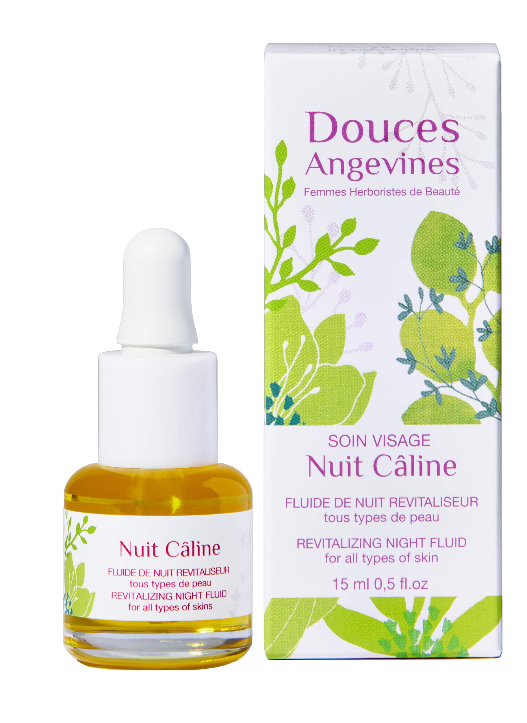 Cuddly night of Douces Angevines Fluid night serum to deeply revitalize the skin. It prevents the skin from skin aging thanks to its natural active ingredients. It strengthens the elasticity, firmness and tone of the epidermis. It nourishes and hydrates the skin for optimal comfort. Use of the night facial treatmentApply in the evening, to cleansed and dry skin. 4 to 5 drops are enough and penetrate very quickly without leaving a greasy film. Night fluid Cuddly nightGlass dropper bottle: 15 ml Labels: Cosmos organic, Vegan Cruelty Free, One voice Composed of 100 ingredients of natural origin and 98.7 from organic farming. Manufactured in France (Region: West) Main ingredients of the organic night facial treatmentSweet Almond from Sicily softens and nourishes to strengthen the elasticity of the skin. Rosehip tones the skin and plays a key role in epidermal regeneration. Auvergne Matricaria and Myrtle offer their anti-aging properties. [ ]INCI: HELIANTHUS ANNUUS SEED OIL , BORAGO OFFICINALIS SEED OIL , PRUNUS AMYGDALUS DULCIS OIL , CARTHAMUS TINCTORIUS SEED OIL , CHAMOMILLA RECUTITA FLOWER EXTRACT , ROSA RUBIGINOSA SEED OIL , PARFUM (ESSENTIAL OILS FRAGRANCE), SESAMUM INDICUM SEED OICareful delivery. INCI: HELIANTHUS ANNUUS SEED OIL , BORAGO OFFICINALIS SEED OIL , PRUNUS AMYGDALUS DULCIS OIL , CARTHAMUS TINCTORIUS SEED OIL , CHAMOMILLA RECUTITA FLOWER EXTRACT , ROSA RUBIGINOSA SEED OIL , PARFUM (ESSENTIAL OILS FRAGRANCE), SESAMUM INDICUM SEED OI. Nuit câline des Douces Angevines Night fluid serum to deeply revitalize the skin. It prevents skin from aging thanks to its natural active ingredients. It strengthens the elasticity, firmness and tone of the epidermis. It nourishes and moisturizes the skin for optimal comfort. How to use the night facial treatment: Apply in the evening to clean, dry skin. 4 to 5 drops are enough and penetrate very quickly. Nuit câline is a revitalizing night fluid for all skin types. (15 ml). Nuit câline des Douces Angevines Sérum fluide de nuit pour revitaliser la peau en profondeur. Il prévient la peau du vieillissement cutané grâce à ses actifs naturels. Il renforce l'élasticité, la fermeté et la tonacité de l'épiderme. Il nourrit et hydrate la peau pour un confort optimal. Utilisation du soin visage de nuitAppliquer le soir, sur une peau nettoyée et sèche. 4 à 5 gouttes suffisent et pénètrent très rapidement sans laisser de film gras. Fluide de nuit Nuit câlineFlacon verre compte-goutte : 15 ml Labels : Cosmos organic, Vegan Cruelty Free, One voice Composé de 100 d'ingrédients d'origine naturelle et 98,7 issus de l'agriculture biologique. Fabrication en France (Région : Ouest) Ingrédients principaux du soin visage bio de nuitL'Amande Douce de Sicile adoucit et nourrit pour renforcer l'élasticité de la peau. La Rose musquée tonifie la peau et joue un rôle capital dans la régénération épidermique. La Matricaire d'Auvergne et la Myrte offrent leurs vertus anti-âge. [ ]INCI : HELIANTHUS ANNUUS SEED OIL , BORAGO OFFICINALIS SEED OIL , PRUNUS AMYGDALUS DULCIS OIL , CARTHAMUS TINCTORIUS SEED OIL , CHAMOMILLA RECUTITA FLOWER EXTRACT , ROSA RUBIGINOSA SEED OIL , PARFUM (ESSENTIAL OILS FRAGRANCE), SESAMUM INDICUM SEED OILivraison soignée. INCI : HELIANTHUS ANNUUS SEED OIL , BORAGO OFFICINALIS SEED OIL , PRUNUS AMYGDALUS DULCIS OIL , CARTHAMUS TINCTORIUS SEED OIL , CHAMOMILLA RECUTITA FLOWER EXTRACT , ROSA RUBIGINOSA SEED OIL , PARFUM (ESSENTIAL OILS FRAGRANCE), SESAMUM INDICUM SEED OI. Nuit câline des Douces AngevinesSérum fluide de nuit pour revitaliser la peau en profondeur. Il prévient la peau du vieillissement cutané grâce à ses actifs naturels. Il renforce l'élasticité, la fermeté et la tonacité de l'épiderme. Il nourrit et hydrate la peau pour un confort optimal.Utilisation du soin visage de nuitAppliquer le soir, sur une peau nettoyée et sèche. 4 à 5 gouttes suffisent et pénètrent très rapid. Nuit câline est un fluide de nuit revitaliseur pour tous types de peaux.(15 ml).