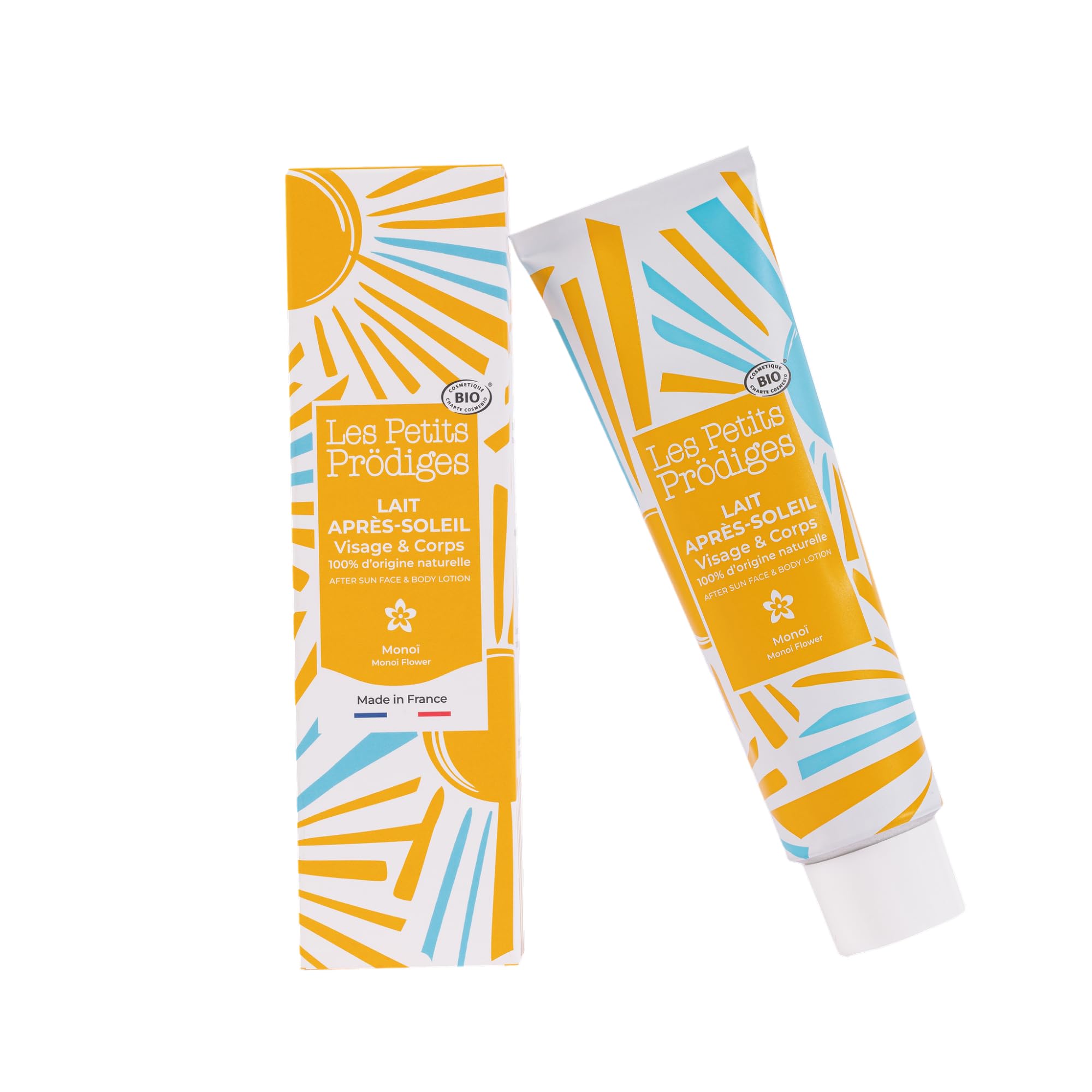 INSTANT REFRESHMENT EFFECT! This milky gel hydrates, soothes, and refreshes the skin after sun exposure, for a sublime, longer-lasting tan. Its melting texture penetrates instantly and soothes overheated skin while protecting it from drying out, without any sticky finish. Let yourself be enchanted by its sweet monoi scent! Suitable for all skin types, even the most sensitive. For face and body. Size: 100mlDIRECTIONS FOR USE: After sun exposure, on clean skin, take a generous amount of milk and gently massage the desired areas until completely absorbed. A 100 natural origin formula certified COSMOS ORGANIC, rated 100 100 on Yuka. Suitable for all skin types, even the most sensitive. For face and body. SCENT: A 100 natural origin Monoï fragrance with sweet notes of white flowers and vanilla developed by a perfumer exclusively for Petits Prödiges. INSTANT REFRESHMENT EFFECT! This milky gel moisturizes, soothes and refreshes the skin after sun exposure, for a sublime tan that lasts longer. EFFET COUP DE FRAIS IMMÉDIAT ! Ce gel lacté hydrate, apaise et rafraîchit la peau après l'exposition au soleil, pour un bronzage sublimé qui dure plus longtemps. Sa texture fondante pénètre instantanément et soulage la peau échauffée tout en la protégeant du dessèchement, sans aucun fini collant. Laissez-vous envoûter par son doux parfum de monoï ! Convient à tous les types de peaux, même les plus sensibles. Pour le visage et le corps. Format : 100mlCONSEILS D'UTILISATION : Après l'exposition au soleil, sur peau propre, prélevez une quantité généreuse de lait et massez délicatement les zones souhaitées jusqu'à absorption complète. Une formule 100 d'origine naturelle certifiée COSMOS ORGANIC, notée 100 100 sur Yuka. Convient à tous les types de peaux, même les plus sensibles. Pour le visage et le corps. SENTEUR : Un parfum de Monoï 100 d'origine naturelle aux notes suaves de fleurs blanches et de vanille développé par un parfumeur exclusivement pour les Petits Prödiges. EFFET COUP DE FRAIS IMMÉDIAT ! Ce gel lacté hydrate, apaise et rafraîchit la peau après l'exposition au soleil, pour un bronzage sublimé qui dure plus longtemps.