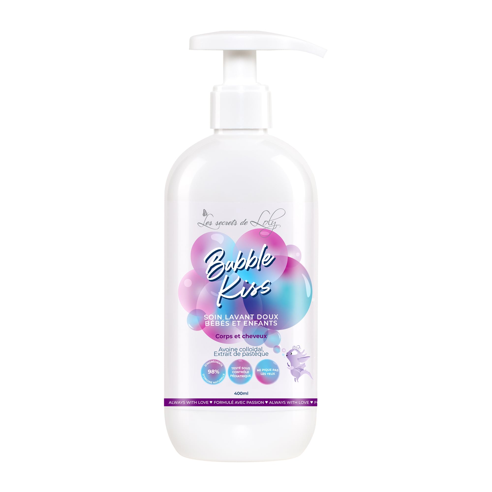 2-IN-1 THAT WON'T STING THE EYES: Perfectly suited for babies, BUBBLE KISS by Les Secrets de Loly is an easy-to-use wash shampoo. Place a small amount in your hand, apply to wet hair and body, massage gently, then rinse with lukewarm water. This gentle shampoo transforms bath time into a truly soothing ritual thanks to its creamy texture and delicately fruity fragrance. A CLEANSING TREATMENT WITH A DELICATE SCENT FOR BABY: More than just a children's shampoo, BUBBLE KISS is a 2-in-1 treatment that makes bath time easier. It is suitable for all types of textured hair and delicate skin, for pleasant and natural daily use. Ideal for parents looking for a gentle and 100 effective shampoo. NATURAL SHAMPOO AND CLEANSING TREATMENT FOR BABY: BUBBLE KISS is a gentle cleansing treatment designed to respect sensitive skin and textured hair from birth. With 98 naturally derived ingredients and tested under pediatric supervision, it gently cleanses baby's body and hair. Certified sulfate-free, silicone-free, and paraben-free, you'll appreciate its formula free of controversial products. Its light lather soothes and moisturizes, for a tender moment at every bath. HYDRATION AND SOOTHING FROM THE FIRST BATH: thanks to its nourishing active ingredients like oat extract and glycerin, BUBBLE KISS ensures light, shiny, and silky curls for children and babies. It's the perfect moisturizing wash to introduce little ones to hair care. Reveal the natural beauty of their textured hair with an effective and gentle wash. A MULTI-PURPOSE BABY WASH: more than just a children's shampoo, BUBBLE KISS is a 2-in-1 product that makes bath time easier. It's suitable for all hair types (wavy, curly, frizzy, kinky) and delicate skin, for pleasant and natural daily use. Ideal for parents looking for a gentle and 100 effective shampoo.2 EN 1 QUI NE PIQUE PAS LES YEUX : parfaitement adapté aux bébés, BUBBLE KISS les Secrets de Loly est un soin lavant shampoing simple à utiliser. Déposez une noisette de produit dans la main, appliquez sur cheveux et corps mouillés, massez délicatement, puis rincez à l'eau tiède. Ce shampoing doux transforme le bain en un véritable rituel apaisant grâce à sa texture onctueuse et son parfum délicatement fruité. UN SOIN LAVANT AU PARFUM DÉLICAT POUR BÉBÉ : plus qu'un simple shampoing enfant, BUBBLE KISS est un soin 2-en-1 qui facilite le bain. Il convient à tous les types de cheveux texturés et à la peau délicate, pour un usage quotidien agréable et naturel. Idéal pour les parents à la recherche d'un shampoing doux et 100 efficace. SHAMPOING ET SOIN LAVANT NATUREL POUR BÉBÉ : BUBBLE KISS est un soin lavant doux conçu pour respecter la peau sensible et les cheveux texturés dès la naissance. Avec 98 d'ingrédients d'origine naturelle et testé sous contrôle pédiatrique, il nettoie en douceur le corps et les cheveux de bébé. Certifié sans sulfate, sans silicone et sans parabène, vous apprécierez sa composition sans produit controversé. Sa mousse légère apaise et hydrate, pour un moment de tendresse à chaque bain. HYDRATATION ET APAISEMENT DÈS LE PREMIER BAIN : grâce à ses actifs nourrissants comme l'extrait d'avoine et la glycérine, BUBBLE KISS assure des boucles légères, brillantes et soyeuses pour les enfants et les bébés. C'est le soin lavant hydratant parfait pour initier les tout-petits aux soins capillaires. Révélez la beauté naturelle de leurs cheveux texturés avec un soin lavant efficace et doux. UN SOIN LAVANT MULTI-USAGE POUR BÉBÉ : plus qu'un simple shampoing enfant, BUBBLE KISS est un soin 2-en-1 qui facilite le bain. Il convient à tous les types de cheveux (ondulés, bouclés, frisés, crépus) et à la peau délicate, pour un usage quotidien agréable et naturel. Idéal pour les parents à la recherche d'un shampoing doux et 100 efficace.Les Secrets de Loly – Bubble Kiss – Soin lavant bébé 2-en-1 corps cheveux Ultra-doux – Peaux sensibles cheveux texturés (dès la naissance) – 98 d'origine naturelle – 400 ml