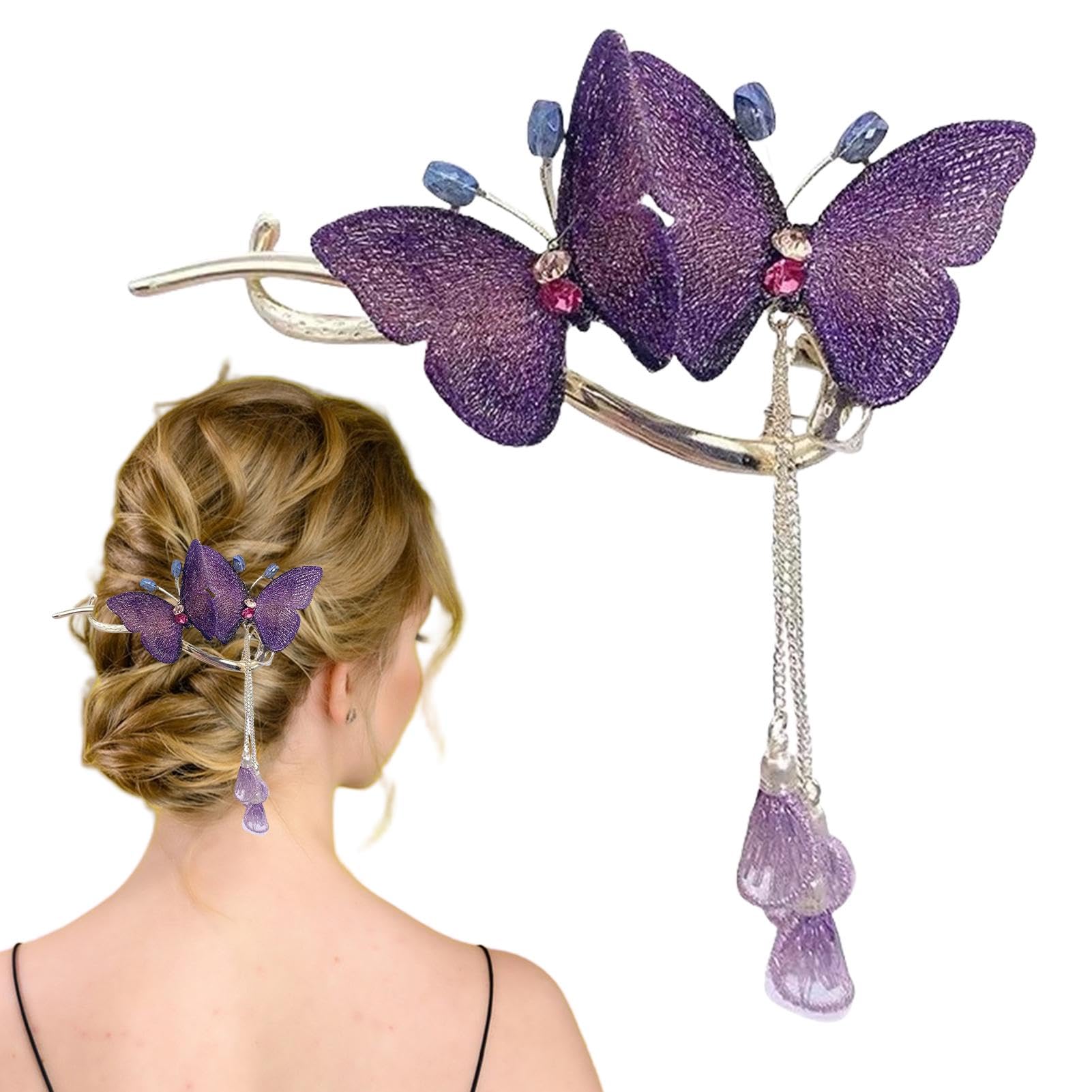 Lesunbak Butterflies Tassel Grab Clip - Elegant Hairpin & Clip For Women Rhinestone Tassel Hair Chain Chic Hair Accessories Nonslip Grip Embellished With Rhinestones For Daily Use Purple
