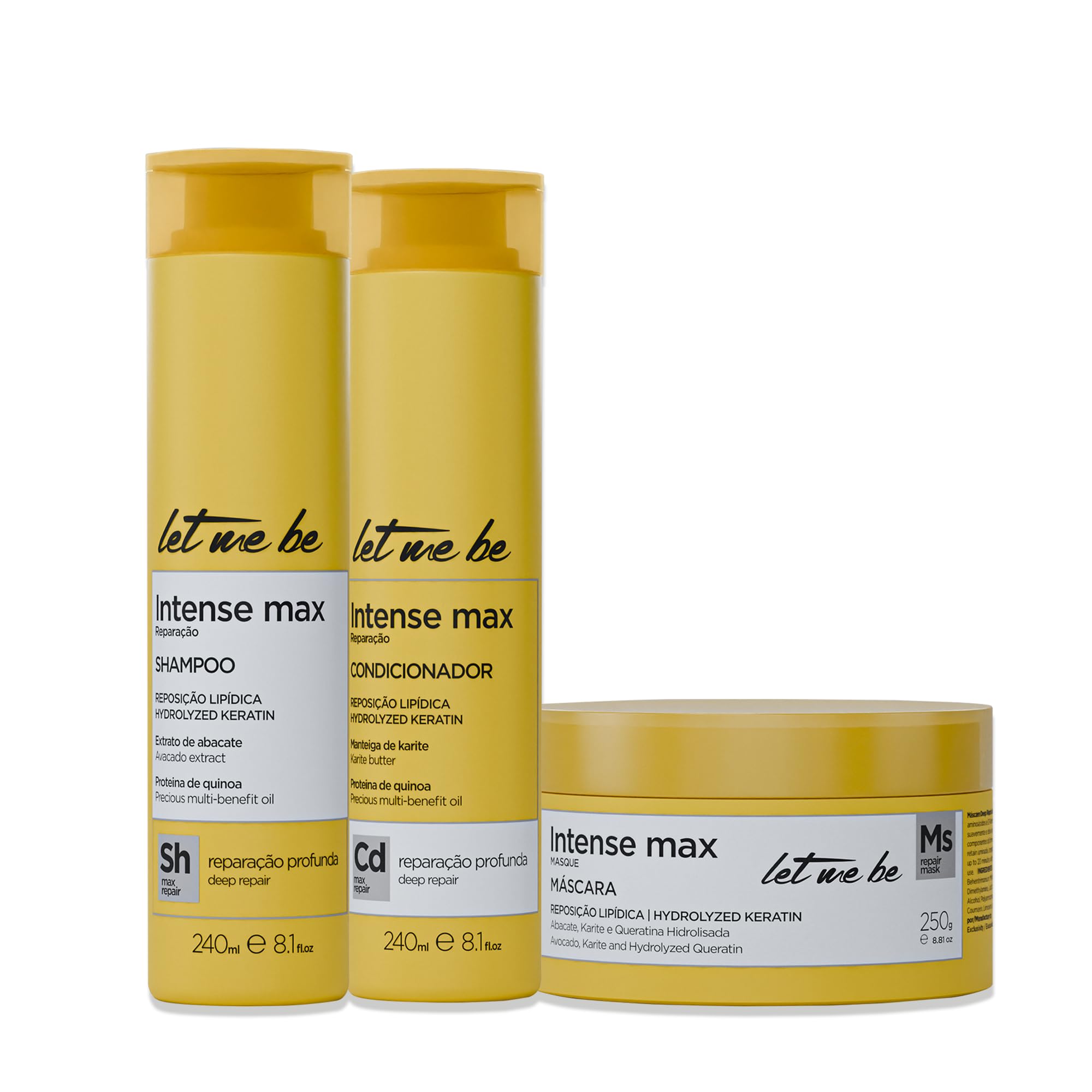 The Intense Max Repair kit hydrates and nourishes dry hair, leaving it soft and shiny. It improves the appearance of dry, dull hair by repairing and moisturizing without weighing it down or adding oil. Intended for dry and dull hair, Intense Max was developed with shea butter, quinoa, and avocado, which have a high nourishing power. It penetrates the hair shaft and replenishes all the nutrients necessary for healthy, beautiful hair. In addition to repairing the hair fiber, which was previously dry due to a lack of moisture and nutrients, it is a fortifying treatment with a protective and restorative effect. We do not test on animals. INGREDIENTS Aqua, cetearyl alcohol, glycerin, cetrimonium chloride, stearamidopropyl dimethylamine, cyclopentasiloxane, dimethicone, alcohol, parfum, lactic acid, behentrimonium methosulfate, peg-90, butyrospermum parkii butter, persea gratissima oil, disodium edta, panthenol, propylene glycol, hydrolyzed quinoa, hydrolyzed keratin, methylchloroisothiazolinone, methylisothiazolinone, amyl cinnamal, benzyl alcohol, benzyl benzoate, cinnamyl alcohol, coumarin, hexyl cinnamal, limonene, linalool. DIRECTIONS 1. Apply the shampoo to wet hair and massage gently. Repeat. 2. Apply the mask to clean, damp hair, section by section, and leave on for 15 minutes after rinsing. 3. Apply conditioner, leave on for a few minutes, and rinse. 4. Once your hair is clean, remove excess water with a towel and apply the leave-in conditioner strand by strand for heat and sun protection. SAFETY WARNING For external use only. Do not expose to sunlight or temperatures exceeding 50 C. Keep out of reach of children. Avoid contact with eyes protect eyes during application. In case of contact, rinse immediately with plenty of water. If irritation occurs, discontinue use and consult a doctor. Follow the directions for use. This product should only be used as directed. See moreRepair and hydration. Suitable for dry hair. Lipid replacement.Let Me Be - Intense Max Repair Kit, Pour cheveux secs et ternes, Au karité, au quinoa et à l'avocat, Remplacement des lipides 3 produits (2x240ml 250g)DESCRIPTION DU PRODUIT DESCRIPTION DU PRODUIT Le kit Intense Max Repair hydrate et nourrit les cheveux secs pour leur donner douceur et brillance. Améliore l'apparence en réparant et hydratant sans sensation de lourdeur ni augmentation de la graisse. Indiqué pour les cheveux secs et ternes, Intense Max a été développé avec du karité, du quinoa et de l'avocat, qui ont un fort pouvoir nutritif. Pénètre les cheveux et reconstitue tous les nutriments nécessaires pour des cheveux sains et beaux. En plus de réparer la fibre capillaire, qui était auparavant sèche par manque d'humidité et de nutriments. C'est un traitement fortifiant avec effet protecteur et réparateur. Nous n'effectuons pas de tests sur les animaux. INGRÉDIENTS Aqua, cetearyl alcohol, glycerin, cetrimonium chloride, stearamidopropyl dimethylamine, cyclopentasiloxane, dimethicone, alcohol, parfum, lactic acid, behentrimonium methosulfate, peg-90, butyrospermum parkii butter, persea gratissima oil, disodium edta, panthenol. Propylene glycol, hydrolyzed quinoa, hydrolyzed keratin, methylchloroisothiazolinone, methylisothiazolinone, amyl cinnamal, benzyl alcohol, benzyl benzoate cinnamyl alcohol, coumarin, hexyl cinnamal, limonene, linalool. MODE D'EMPLOI Appliquer le shampooing sur cheveux mouillés et masser doucement. Répétez l'opération. 2. Appliquez le masque sur cheveux propres et humides, mèche par mèche, et laissez agir 15 minutes après rinçage. 3. Appliquer l'après-shampooing, laisser agir quelques minutes et rincer. 4. Une fois les cheveux nettoyés, retirez l'excès d'eau avec une serviette et appliquez le Leave-in mèche par mèche, pour une protection thermique et solaire AVERTISSEMENT DE SÉCURITÉ Usage externe. Ne pas exposer à la lumière du soleil ou à des températures supérieures à 50 C. Tenir hors de portée des enfants. Éviter le contact avec les yeux, protéger les yeux lors de l'application. En cas de contact, rincer immédiatement avec beaucoup d'eau. En cas d'irritation, arrêtez l'utilisation et consultez un médecin. Suivez les instructions d'utilisation. Ce produit ne doit être utilisé qu'aux fins prévues. Voir plusRéparation et hydratation. Convient aux cheveux secs. Remplacement des lipides.