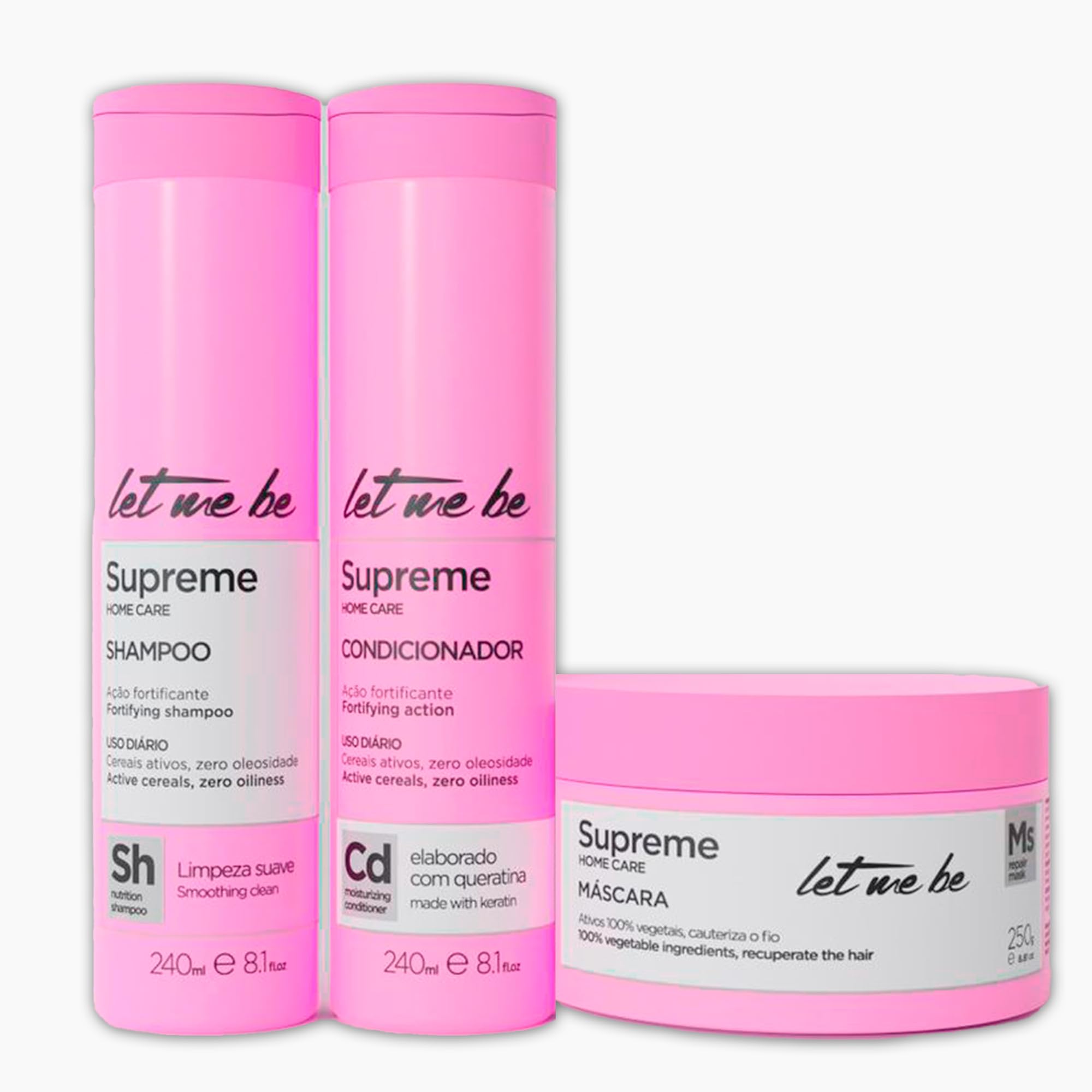 The Home Care Supreme kit is ideal for extremely porous, lifeless, and devitalized hair. It promotes gentle cleansing with a creamy lather enriched with plant-based keratin obtained by combining hydrolyzed proteins from cereals, oats, and soy, leaving hair clean and shiny. The conditioner is rich in high molecular weight peptides with revitalizing and moisturizing action, forming a protective film that keeps hair hydrated and restored. The mask maintains extremely restored and cured hair, repairing the damaged keratin structure. The result is strong, deeply nourished, and bouncy hair. We do not test on animals. INGREDIENTS Aqua, cetearyl alcohol, ceteareth-20, cetrimonium chloride, behentrimonium chloride, paraffinum liquidum, propylene glycol, butyrospermum parkii butter, aminopropyl phenyl trimethicone, panthenol, polyquaternium-10, tocopheryl acetate, hydrolyzed keratin, hydrolyzed wheat protein, hydrolyzed soy protein, argania spinosa kernel oil, avena sativa seed extract, aloe barbadensis leaf extract, parfum, fenoxiethanol, BHT, disodium EDTA, and citric acid. DIRECTIONS Apply the shampoo to wet hair and massage until a lather forms. Repeat. On wet hair, apply the mask to all of your hair, section by section. Leave on for 10 to 20 minutes. Rinse out 100 of the product. Next, apply the conditioner, massaging well to distribute the product evenly. Leave on for 2 to 3 minutes, emulsify, and rinse thoroughly. Not recommended for use on hair roots. SAFETY WARNING For external use only. Do not expose to sunlight or temperatures exceeding 50 C. Keep out of reach of children. Avoid contact with eyes protect eyes during application. In case of contact, rinse immediately with plenty of water. If irritation occurs, discontinue use and consult a physician. Follow the directions for use. This product should only be used as directed. See moreIntense Repair Mask: This mask deeply repairs and seals the hair, restoring its structure and resulting in significantly stronger, nourished hair with natural movement. Intense Hydration and Shine: Rich in high molecular weight peptides, this conditioner provides deep hydration, forming a protective film that keeps hair nourished and moisturized for longer. Suitable for Chemically Treated Hair: Specially formulated for extremely porous and devitalized hair, it repairs damaged keratin structures and restores strength and vitality to the strands. Long-Lasting Softness: Promotes gentle cleansing with a creamy lather enriched with plant-based keratin obtained by combining hydrolyzed cereal, oat, and soy proteins, leaving hair clean and shiny.Let Me Be - Kit Supreme Home Care, shampooing, après-shampoing et masque, douceur prolongée, ingrédients 100 végétaux 2 x 240 ml et 250 gDESCRIPTION DU PRODUIT DESCRIPTION DU PRODUIT Le kit Home Care Supreme est idéal pour les cheveux extrêmement poreux, dévitalisés et sans vie. Favorise un nettoyage doux avec une mousse crémeuse, enrichie en kératine d'origine végétale obtenue par l'association de protéines hydrolysées de céréales, d'avoine et de soja qui garde les cheveux propres et brillants. L'après-shampooing est riche en peptides de haut poids moléculaire avec action revitalisante, hydratante et formant un film protecteur, gardant les cheveux hydratés et récupérés. Le masque maintient les cheveux extrêmement récupérés et cautérisés, réparant la structure de kératine endommagée. Le résultat est des cheveux forts, très nourris et bougants. Nous n'effectuons pas de tests sur les animaux. INGRÉDIENTS Aqua, cetearvi alcohol, ceteareth-20, cetrimonium chloride, behentrimonium chloride, paraffinum liquidum, propyleneglycol, butvrospermum parkii butter, aminopropyl phenyl trimethicone, panthenol, polyquaternium-10, tocopheryl acetate, hydrolyzed keratin, hydrolyzed wheat protein, hydrolyzed soy protein, argania spinosa kernel oil, avena sativa seed extract, aloe barbadensis extract, parfum, fenoxietanol, bht, disodium edta and citric acia. MODE D'EMPLOI Appliquer le shampooing sur cheveux humides et masser jusqu'à obtenir de la mousse. Répétez l'application. Sur cheveux mouillés, appliquez le masque sur tous les cheveux, mèche par mèche. Laisser agir 10 à 20 minutes. Rincez 100 du produit capillaire. Ensuite, appliquez le revitalisant, en massant bien pour répartir le produit uniformément. Laisser agir 2 à 3 minutes, émulsionner et bien rincer. Non recommandé pour une utilisation sur les racines des cheveux. AVERTISSEMENT DE SÉCURITÉ Usage externe. Ne pas exposer à la lumière du soleil ou à des températures supérieures à 50 C. Tenir hors de portée des enfants. Éviter le contact avec les yeux, protéger les yeux lors de l'application. En cas de contact, rincer immédiatement avec beaucoup d'eau. En cas d'irritation, arrêtez l'utilisation et consultez un médecin. Suivez les instructions d'utilisation. Ce produit ne doit être utilisé qu'aux fins prévues. Voir plusMasque réparateur intense : le masque répare en profondeur, cautérise le cheveu et restaure sa structure, résultant en des cheveux beaucoup plus forts, nourris et avec un mouvement naturel. Hydratation et brillance intense : le revitalisant, riche en peptides de haut poids moléculaire, offre une action hydratante profonde, formant un film protecteur qui maintient les cheveux nourris et hydratés plus longtemps. Convient aux cheveux traités chimiquement : spécialement formulé pour les cheveux extrêmement poreux et dévitalisés, réparant la structure de kératine endommagée et redonnant force et vitalité aux mèches. Effet de douceur prolongée : favorise un nettoyage doux avec une mousse crémeuse, enrichie en kératine d'origine végétale obtenue par l'association de protéines hydrolysées de céréales, d'avoine et de soja qui garde les cheveux propres et brillants.
