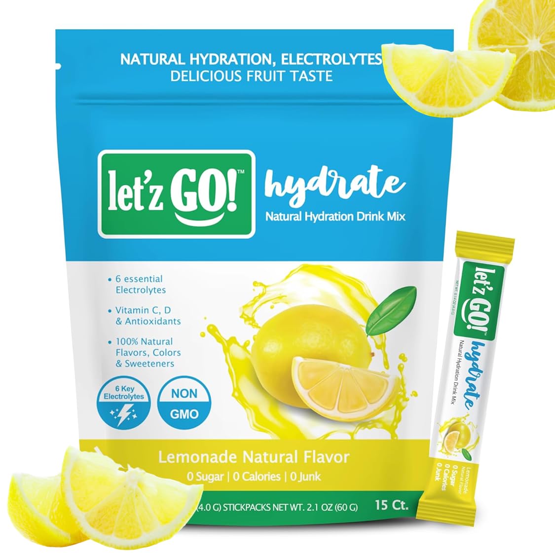 EASY CONVENIENT - Each single serving packet is super easy for you to enjoy, whether you're On-the-Go, at work, at home, at school, at the gym, or travelling. Just add one stick pack to 16oz of water, stir or shake, and enjoy! Tastes great in smoothies, juice, sparkling or bottled water, or even in cocktails. Now Letz Go!. ANYTIME HYDRATION - Perfect for your morning routine, an afternoon drink, when you workout, for travel, and most of all, for staying hydrated throughout the day. Great for On-the-Go, at the gym, during sports. helping you drink more water, or whenever you need to quench your thirst!. NO SUGAR, NO CALORIES, DELICIOUS FLAVOR - Available in two great-tasting natural fruit flavors: Lemonade and Fruit Punch. Letz Go Hydrate is a natural, refreshing way to get a stay hydrated with essential daily electrolytes and nutrition without the sugar, calories or added junk. Forget the sugary drinks, juices, or sports beverages.get your daily hydration with the natural, delicious taste of Letz Go Hydrate. ALL NATURAL - Made with 100 Natural fruit flavors and plant-based colors, Letz Go Hydrate is sweetened with pure Stevia leaf with no aftertaste. Absolutely No artificial ingredients, colors, dyes, or preservatives. Letz Go Hydrate is your go-to hydration and electrolyte drink, perfect for any diet or fitness routine whether you're looking to lose weight, cut back on sugar, or quench your thirst. ELECTROLYTES HYDRATION - Letz Go Hydrate is a delicious, refreshing natural hydration drink mix designed to give you 6 essential electrolytes, nutrition, and daily hydration. Packed with 6 key electrolytes for balanced support, including sodium, potassium, magnesium, calcium, phosphorus, and zinc, high Vitamin C and D, antioxidants, and no sugar or calories, Let'z Go Hydrate is your go-to drink for daily hydration and essential nutrition.