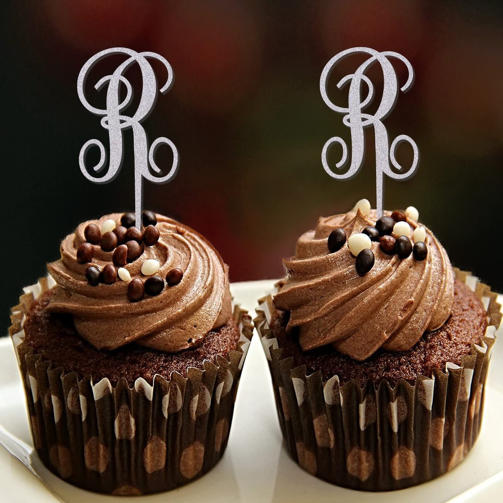 Letter R Wedding Cupcake Toppers Monogram Initial Last Name Glitter Silver For Wedding Bridal Shower Decorations Funny Reusable Floral Wreath Custom Any Initial Bridal Shower Gifts 6PCS Style-4