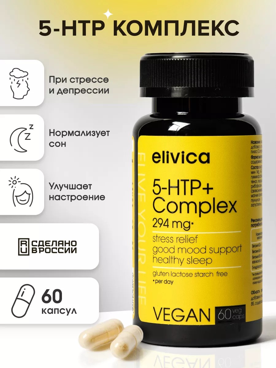 The 5-HTP+ vitamin complex reduces the effects of stress on the body and normalizes mood. Created specifically for health-conscious men and women. 5-hydroxytryptophan is a natural amino acid, a precursor to serotonin (the feel-good hormone). Extracted from griffonia seeds, 5-HTP acts as a natural herbal antidepressant, sedative, and anti-stress agent (helps reduce anxiety, prevent panic attacks, and alleviate irritability, neurosis, and depression). It regulates melatonin production, which is responsible for the sleep cycle and quality. As a result, the complex improves sleep quality and reduces the time it takes to fall asleep. Vitamins for sleep. 5-hydroxytryptophan has been clinically proven to demonstrate excellent results in normalizing a healthy sleep cycle, restoring sleep quality and duration, improving mood, reducing the intensity of headaches and migraines, and reducing food cravings (e.g., for sweets and starchy foods), which contributes to appetite suppression and weight loss. As a serotonin precursor, 5-hydroxytryptophan influences dopamine, norepinephrine, and melatonin levels, making it particularly effective in combating anxiety and apathy and helping to reduce the effects of stress on the body. The effectiveness of 5-HTP is also due to the inclusion of auxiliary elements in the complex. The formation of serotonin in the body from 5-HTP is initiated by an enzyme whose activity is directly dependent on magnesium and vitamin B6 levels. B6 deficiency, in turn, can also be caused by stress and nervous overload. Vitamin B6 is converted to its active form with the help of Riboflavin (vitamin B2) and magnesium, which is absorbed only in the presence of vitamin B5 (calcium panthenate). It influences the function of the adrenal glands and the synthesis of cortisol and insulin. By increasing B5 levels, the synthesis of stress hormones is inhibited. The synergistic action of the active components of the product significantly improves the quality of life's most important factors, naturally increasing serotonin levels, regulating sleep and carbohydrate metabolism, eliminating anxiety, and reducing the impact of stress on the male and female body. This is not a medicine. Directions (for adults): 1 capsule 2 times daily with meals. Duration of treatment: 1 month. If necessary, treatment can be repeated. It is recommended to consult a doctor before using multivitamins. Contraindications: individual intolerance to the components, pregnancy, breastfeeding. Also, taking antidepressants and drugs that affect serotonin synthesis. The capsule form is more convenient to use than tablets. Raw materials are sourced from the UK, Germany, and South Korea. Elivica natural dietary supplements are concentrated for an active and healthy lifestyle. Our dietary supplements are also searched for using the search term "elivica" or "elivica." We have special offers and sales, so you can buy our products as gifts at a discount!