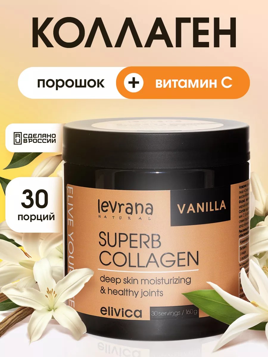 Eliva collagen powder with vanilla flavor by Levrana. SUPERB COLLAGEN VANILLA is a vanilla-flavored super collagen powder made from high-quality raw materials. Collagen is a binding protein synthesized by our body, whose function is to "stitch" connective tissue cells together. Collagen is an essential resource for the synthesis of almost 40% of peptide compounds in the human body. It is responsible for the elasticity and strength of skin, tendons, ligaments, and cartilage, and helps maintain healthy bones and hair. It promotes faster recovery from colds and the formation of a robust immune response. As a source of highly purified protein, it helps resist overeating and dietary irregularities (it is a low-calorie, muscle-building material). Collagen is an amino acid booster for the formation of most hormones: it helps normalize sleep and regenerate all body systems, even under intense physical, mental, and emotional stress. In an aggressive environment and due to micronutrient deficiencies in refined foods, collagen production slows down even earlier than in previous generations. After age 25, the human body begins to lose up to 1-2% of collagen per year. By age 60, the average person's collagen content is no more than 50%. This level of collagen is only possible in excellent health; otherwise, the level is much lower. Taking collagen from Elivica: optimizes post-traumatic tissue regeneration; improves skin smoothness, hydration, and elasticity; reduces wrinkles and prevents their early formation; normalizes metabolism: collagen promotes weight loss and a toned body contour; strengthens the heart muscle (myocardium); increases blood vessel elasticity; prevents stretch marks, cellulite, and sagging skin contours on the body and face. Vanilla-flavored collagen has a slightly sweet, but not cloying, light and unsaturated taste. It's not only a healthy addition to your diet but also a true delight for your taste buds. Adults take 1 scoop (5290 mg) immediately after meals, mixed with 100 ml of room-temperature water. Recommended duration: 1 month. Repeat if necessary. It's important to take collagen with the vitamin C already included. Contraindications: individual intolerance to any of the ingredients, pregnancy and breastfeeding. Consult a physician before use. The recommended dose (5290 mg) provides the daily requirement for the following nutrients: Vitamin C 333% (200 mg), L-glycine 23% (794 mg), L-hydroxyproline (370 mg). We have special offers and sales, so you can buy our products as gifts at a discount! Elivica natural dietary supplements are concentrates for an active and high-quality life. Our dietary supplements are also searched for by the search term "elivica" or "elivica."