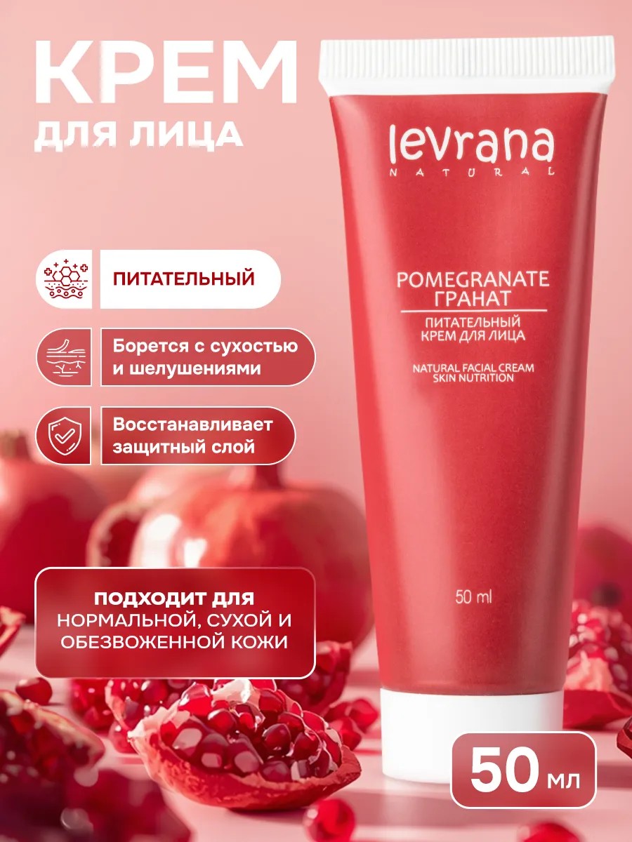 The Pomegranate nourishing face cream is based on organic pomegranate seed oil, which has rejuvenating properties, moisturizes and nourishes, and has a comprehensive effect on the skin. Key active ingredients and natural composition: green coffee extract has a toning effect. Birch bud extract stimulates circulation, improving complexion. Schisandra chinensis tones and enhances the skin's protective functions. Yarrow extract restores skin cells and has an anti-inflammatory effect. The cream is an MLE (Multi-Lamellar Emulsion). This structure is closest to the structure of the upper layer of the skin, which increases the effectiveness of the cream and helps maintain the moisture balance in the cells. The cosmetic product has a high naturalness index. This universal cream is suitable for all skin types, especially normal, dry, and dehydrated skin. Recommended for use from the age of 18. For mature skin 35+, it is recommended to use it as additional nutrition along with the serum. Apply the cream to cleansed skin whenever hydration is needed. Massage it in. Use the Pomegranate Eye Cream as a complementary treatment. Skincare from the Russian brand Levrana is an excellent choice for modern women. We have special offers and sales, so you can get a discount on our products as gifts!