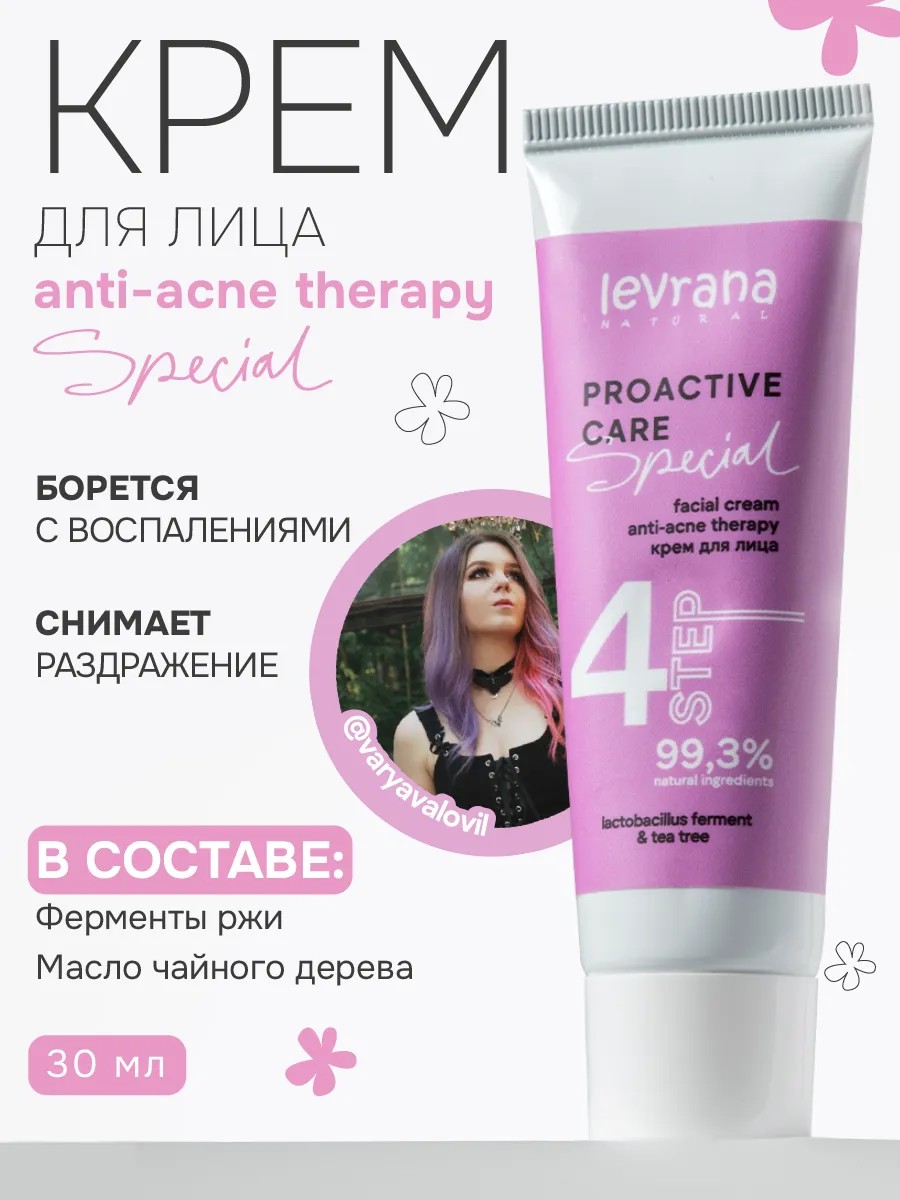 Anti-Acne Therapy Special face cream with rye enzymes and tea tree oil is designed to combat pimples, comedones, and blackheads—the best solution for imperfections. Its specially developed formula provides intensive care for oily, combination, and problematic skin, leaving it looking healthy and flawless. Active ingredients include organic rye enzymes—a gentle alternative to highly concentrated acids. The gentle exfoliant exfoliates the stratum corneum, renews the epidermis, and detoxifies. Active enzymes are highly effective in combating acne and seborrhea, reducing the number of comedones, and providing an anti-inflammatory effect. With each use, skin texture and tone improve, wrinkles become less visible, and redness and unwanted pigmentation are reduced. The skin's normal pH is restored. Tea tree oil, a natural antiseptic, has anti-inflammatory properties, treats blemishes, reduces the appearance of acne, unclogs pores, and prevents acne scars. Its light texture absorbs instantly without leaving a greasy or sticky feeling on the skin. This acne treatment can be used morning and evening, and can also be applied before makeup for all-day protection. Apply the product to cleansed skin. Massage it in. It is recommended to use it as a nourishing supplement after serum. The convenient tube format allows for economical and hygienic use. This healing cream helps tighten pores on the face and is suitable for both teenagers and adults, women and men. This cream will become your indispensable assistant in the fight for beautiful and healthy skin. We have promotions and sales, so you can buy our products as gifts at a discount!
