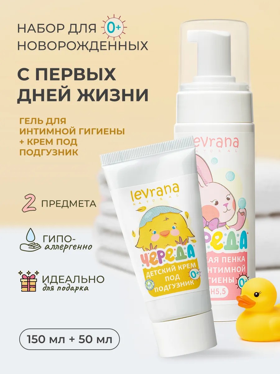 The Levrana Gift Set for Delicate Care 0+ combines two popular baby care products from birth. These body and intimate care products are formulated with natural oils and extracts. 99.5% natural ingredients. Carefully selected gentle ingredients in this baby wash foam gently normalize the microflora, maintaining a natural pH of 5.5, which is especially important for newborns. Plant components provide a preventative effect, maintaining effective mucosal protection against infections. Succession extract has softening and anti-inflammatory properties, nourishing and softening sensitive baby skin. NO parabens, soap, dyes, or ethanol. Suitable even for babies with sensitive and allergy-prone skin. Squeeze a small amount of foam into your palm, apply to your baby's intimate areas, then rinse thoroughly with warm water. The foam is long-lasting and economical to use thanks to the convenient dispenser. This diaper cream will keep your baby's skin healthy, preventing diaper rash and irritation. The zinc content of the cream slightly dries the skin. A complex of valuable plant oils (almond, shea, and olive) softens, nourishes, and creates a natural protective barrier on the skin. This product is a MLE (Multi-Lamellar Emulsion). This structure closely resembles the structure of the upper layer of the skin, increasing the effectiveness of the cream and helping to maintain cellular moisture balance. Apply a small amount of cream to the skin with gentle massage movements. We have special offers and sales, so you can buy our products as gifts at a discount!