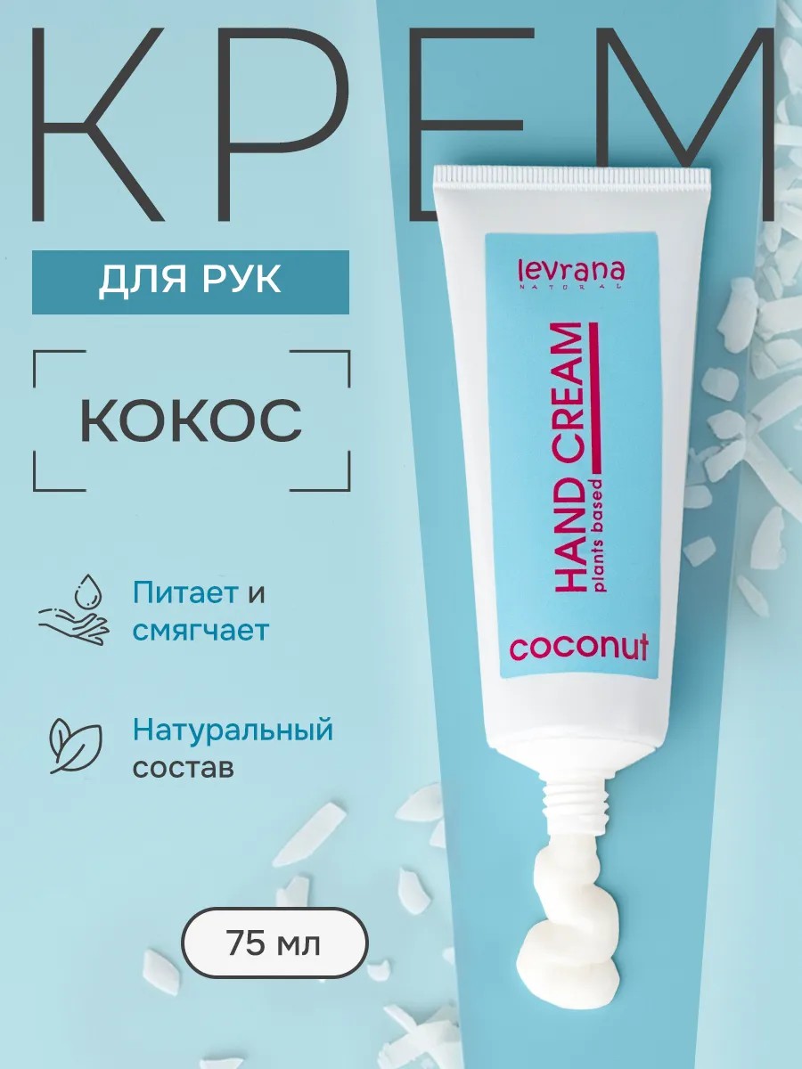 Natural nourishing hand cream with Coconut effectively moisturizes and softens the skin of your hands, leaving it soft, silky, and nourished. Levrana products come in a convenient 75 ml tube. The delicate texture absorbs easily, leaving a subtle and sweet scent of ripe coconut on your skin. This nourishing cream with active ingredients and clover extract is recommended for protecting the skin of your hands and nails from environmental influences and is ideal for winter care. Hand care products with a complex of oils prevent aging and dehydration. Cream with natural coconut oil intensively nourishes, softens, and restores dry, flaky skin. Shea butter deeply moisturizes, relieves irritation, and helps restore its structure. Vitamin E, in the form of a complex of tocopherols, is an antioxidant that protects against negative environmental influences, such as temperature fluctuations and chapped skin, which is especially important during the cold season. Clover extract has unique properties that help improve skin texture, moisturize, and soften, reducing inflammation and irritation. Suitable for daily care for all skin types, this winter cream can be used at any time for additional hand hydration or as a massage product after a long day at work. This hand cream has a pleasant consistency and leaves no stickiness or greasiness. Create a spa experience at home: apply a small amount of cream to clean, dry skin and massage in until completely absorbed. The versatile bottle design fits perfectly in a men's or women's cosmetic bag. A gift set with this skincare product will deservedly take its place among your cosmetics collection. Women's and men's skincare products from Levran are the perfect gift for a birthday or other occasion. We have special offers and sales, so you can purchase our products as gifts at a discount!