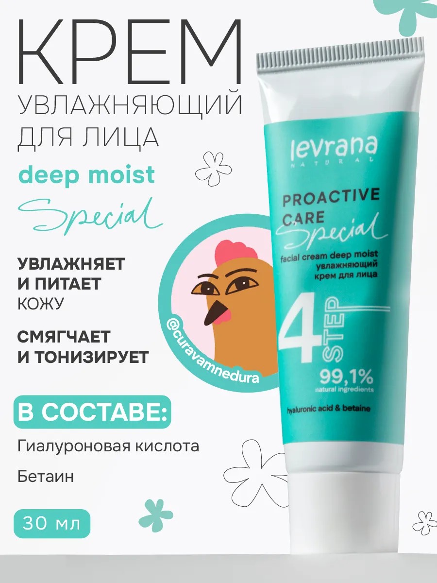 Натуральный крем для лица deep moist увлажняет и освежает кожу, активизирует кожное дыхание. Гиалуроновая кислота трех видов молекулярного веса насыщает кожу влагой, стимулирует образование коллагеновых волокон и предотвращает их разрушение, помогая сохранить упругость и эластичность кожи и предотвратить шелушение. Формула на основе алоэ вера увлажняет, снимает сухость, помогая коже дольше оставаться увлажненной. Бетаин защищает клетки от потери влаги, укрепляет клеточные мембраны, придает коже мягкость, участвует в синтезе коллагена и эластина. Комплекс токоферолов (витамин Е) защищает кожу от негативного воздействия свободных радикалов, помогая ей бороться с окислительным стрессом (одной из основных причин старения кожи). Созданный на основе натуральных компонентов он обеспечивает интенсивное увлажнение, питание, улучшает общее состояние кожи. Легкая текстура дарит мгновенное ощущение свежести и придает лицу здоровое естественное сияние, не оставляя ощущения пленки и липкости, что делает его идеальным для использования в дневное время как базу под макияж. Крем идеально подходит для всех типов кожи: сухую, жирную, комбинированную и проблемную. Удобный дозатор позволяет легко и экономично наносить средство. Уходовая косметика эсклюзивной линейки косметических средств поэтапного ухода за кожей levrana special, созданная специально для маркетплейсов в коллаборции с блогером. Применение: Нанести крем на очищенную кожу лица. Распределить по массажным линиям. Рекомендуется использовать в качестве дополнительного питания после сыворотки. Легкий крем идеально подходит для всех возрастов и типов кожи, включая мужскую, подростковую и чувствительную.