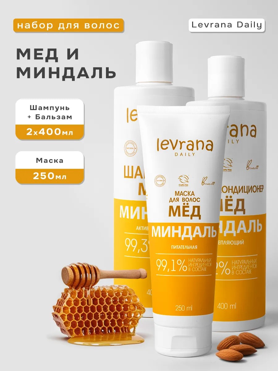 Косметический набор Levrana Daily для укрепления и роста волос Мед и миндаль – профессиональный уход за волосами у вас дома, состоящий из шампуня, бальзама и маски. Натуральный шампунь на основе растительных ингредиентов и мягкого ПАВ. Бережно очищает волосы, делая их сильными, шелковистыми и густыми. Мед укрепляет луковицы, уменьшает выпадение и стимулирует рост волос. Миндальное масло придает волосам энергию и жизненную силу, питает волосы, повышает их эластичность. Бетаин и инулин увлажняют, разглаживают волосы, облегчают расчесывание. Экстракт черного перца тонизирует кожу головы, укрепляет волосы. Экстракт крапивы придает блеск волосам, предотвращает появление перхоти. Экстракт овса восстанавливает поврежденные волосы, насыщает их питательными веществами. Натуральный бальзам-кондиционер Мед и миндаль облегчает расчесывание волос, защищает от негативного воздействия окружающей среды, повышает их прочность и эластичность. Масло кокоса увлажняет и питает волосы. Витамин Е ‒ сильнейший антиоксидант. Он нейтрализует свободные радикалы, повреждающие волосяные фолликулы, что способствует прекращению выпадения волос и поддержанию их здоровья. Питательная натуральная маска для волос питает и насыщает волосы полезными веществами. Масло миндаля насыщает волосы витаминами, питает по всей длине, помогая избежать пересушивания и сечения. Протеины сои восстанавливают волосы изнутри, заполняя пустоты в структуре волос, а также оберегают их от агрессивного воздействия окружающей среды. Не содержат SLS, силиконов и парабенов. Для всех типов волос. Набор для волос Укрепление и питание с маслом миндаля и медом подходит для всех и способен разбудить даже самые безжизненные локоны, восстанавливая и укрепляя волосы, придавая им здоровый и сияющий вид.