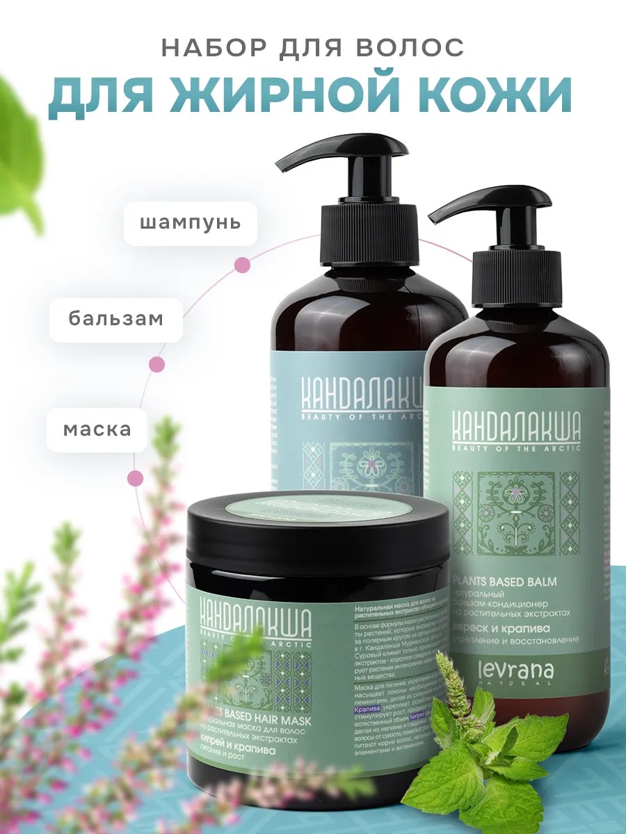 Набор для волос Кандалакша для жирной кожи головы включает в себя натуральные шампунь, бальзам и маску для волос. Подходит для всех типов волос, особенно для жирных. Шампунь на растительных экстрактах для жирной кожи головы эффективно очищает волосы от загрязнений и скоплений себума. Вереск обладает антисеборейным эффектом, нормализует выработку кожного сала, устраняет избыточную жирность волос. Крапива укрепляет волосы и стимулирует рост, возвращает локонам природный блеск и мягкость. Мята освежает и тонизирует, надолго оставляет ощущение свежести и чистоты. В составе содержатся мягкий очищающий ПАВ из кокосового масла и множество других компонентов для увлажнения и питания, устранения сухости и ломкости. Восстанавливающий шампунь оказывает комплексное воздействие. Обладает увлажняющим и разглаживающим эффектом. Натуральный бальзам на растительных экстрактах обеспечит эффективное преображение поврежденных волос, придает гладкость без потери объема, облегчает расчесывание и укладку. Маска для питания, укрепления и роста волос насыщает локоны необходимыми микроэлементами, делая их сильными и крепкими. Сочетание активных растительных компонентов дарит комплексный уход: укрепление, питание, силу и рост. Не утяжеляет пряди и не лишает волосы объема. Средства не содержат SLS и парабенов, силиконов, минеральных масел, красителей, компонентов животного происхождения. Весь подарочный набор уходовой косметики является универсальным и подходит и для женщин, и для мужчин. Он предоставляет профессиональный уровень ухода за волосами у вас дома, помогая достичь здорового и красивого вида. Средства подходят для всех типов волос и не перегружают кожу головы. Идеальный подарочный набор для ваших близких.
