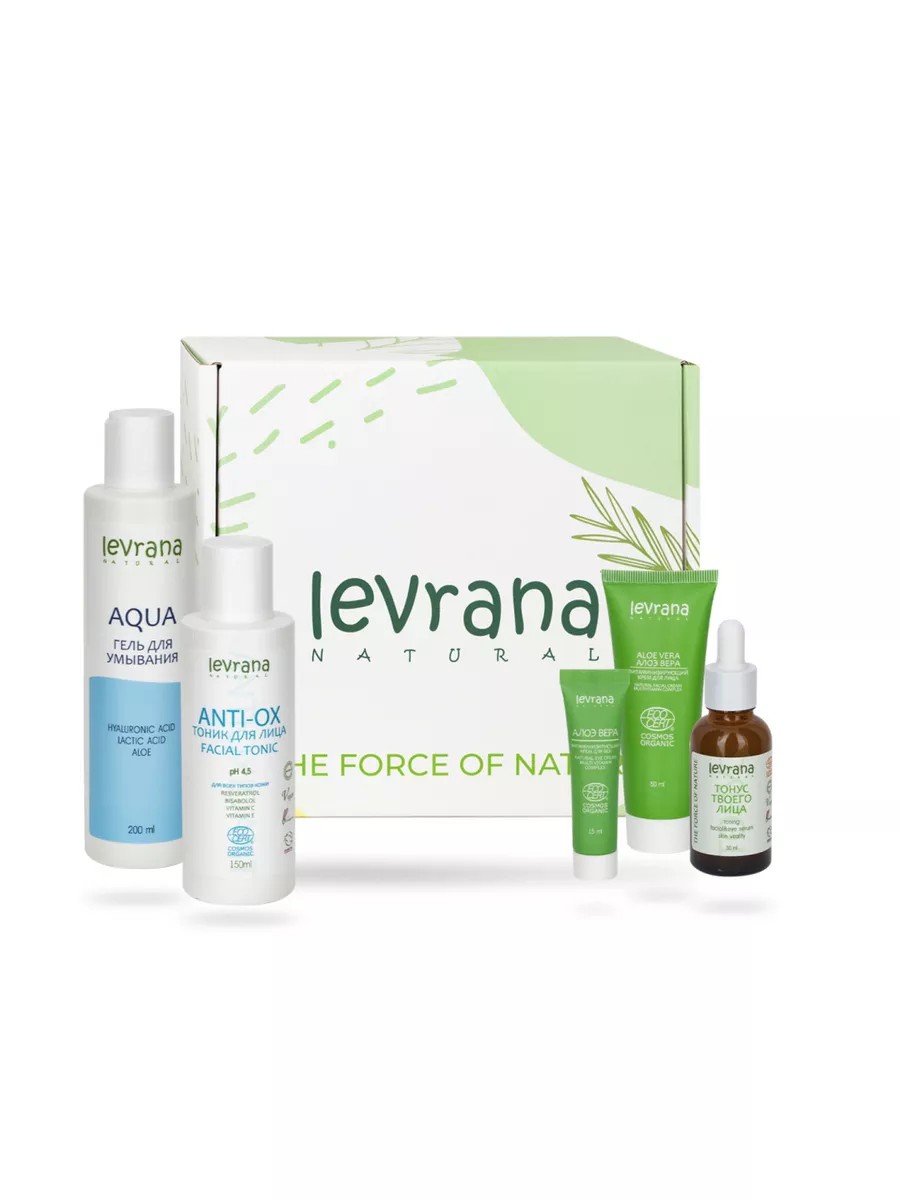 Набор включает в себя полноразмерные бестселлеры по уходу за кожей лица, которые подойдут любому типу кожи.Натуральные составы для пяти шагов в уходе: очищение (гель для умывания), тонизирование (тоник), интенсивный уход (сыворотка), питание и увлажнение лица и кожи глаз (кремы для лица и век). Каждое средство подготавливает кожу к нанесению следующего и усиливает результат.В наборе:1. Гель для умывания AQUA, 200 мл2. Тоник для лица Anti-оx, 150 мл3. Сыворотка для лица "Тонус твоего лица", 30 мл4. Крем для лица Алоэ Вера, 50 мл5. Крем для век Алоэ Вера, 15 млСостав: Смотреть на упаковке средств