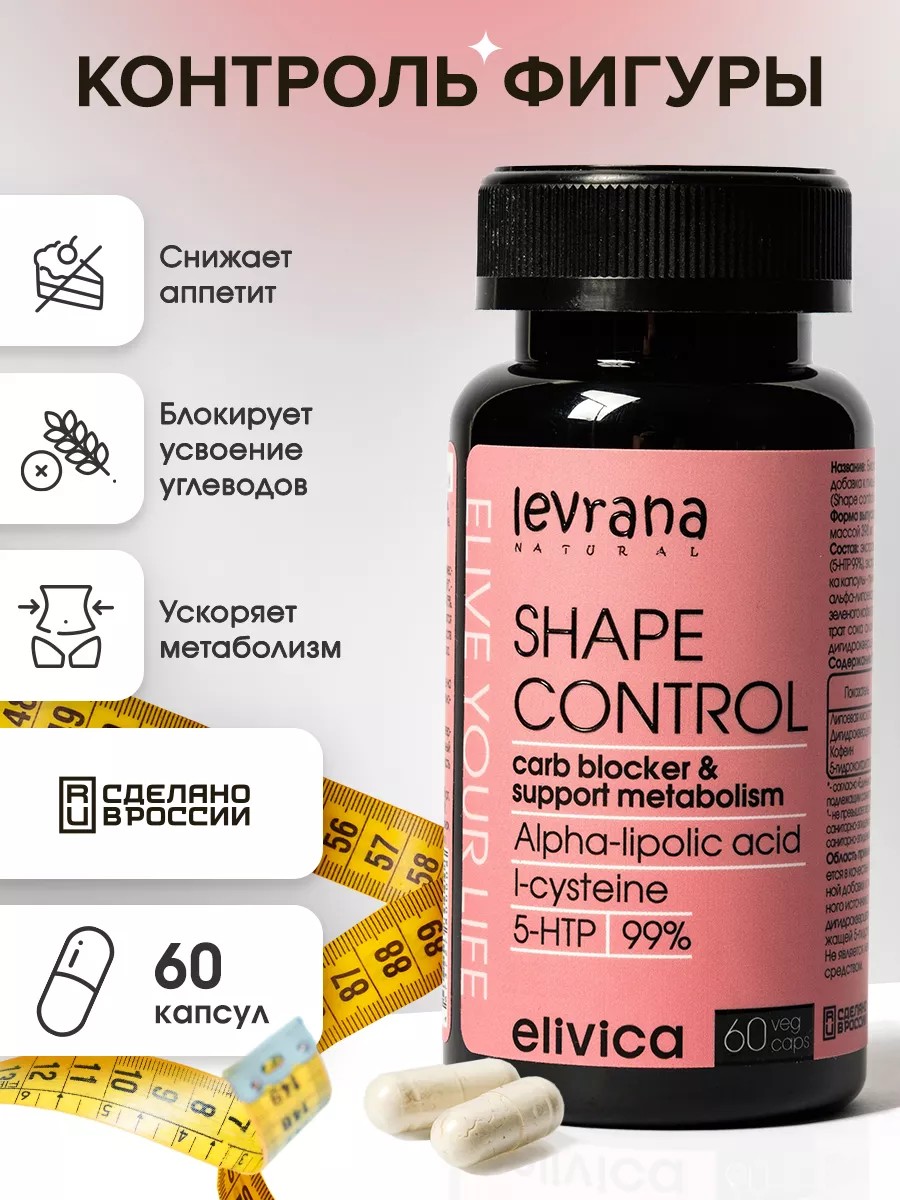 The SHAPE CONTROL complex reduces carbohydrate absorption and accelerates metabolism. It is an effective tool for weight management, fluid retention, appetite suppression, and sculpting your figure. Bean extract acts as an amylase inhibitor, blocking carbohydrate absorption and thereby preventing fat formation. Alpha-lipoic acid plays a key role in carbohydrate utilization and normal energy metabolism, improving cellular energy status. The synergistic system of alpha-lipoic acid (ALA) and cysteine (CYS) is an effective fat burner (fat burning, belly fat reduction). Active fat breakdown leads to the production of energy needed for exercise, which is also directly related to caffeine's effect on energy metabolism. Caffeine improves blood microcirculation, increases energy reserves, supports nervous system function and overall tone in both men and women, and accelerates fat breakdown during regular physical activity, promoting weight loss and a drainage effect. L-5-Hydroxytryptophan (5-HTP), a precursor to serotonin (a neurotransmitter of satisfaction), helps manage weight by reducing the factors of "psychological overeating" and stress-eating. The full spectrum of polysaccharides in aloe concentrate soothes irritated gastric mucosa, promotes detoxification, and helps restore absorption and digestion processes in the small intestine, which is essential for weight management in both women and men. Dihydroquercetin helps lower cholesterol levels and combats oxidative stress, helping remove acidic metabolic products from the blood and tissues, thereby enhancing the bioavailability of the main active ingredients. Vegan-friendly. Directions: Adults take 1 capsule twice daily with meals. Duration of treatment: 1 month. For best results, combine the supplements with exercise and a healthy diet. The detox diet will be easy and enjoyable, as this weight loss product does not cause any discomfort. Before using vitamins, it is recommended to consult a doctor. Raw materials are sourced from India, Mexico, and Russia. Levran's natural elivica supplements are concentrated for an active and healthy lifestyle. Our supplements are also searched for "elivica." We have special offers and sales, and you can purchase our products as gifts at a discount!