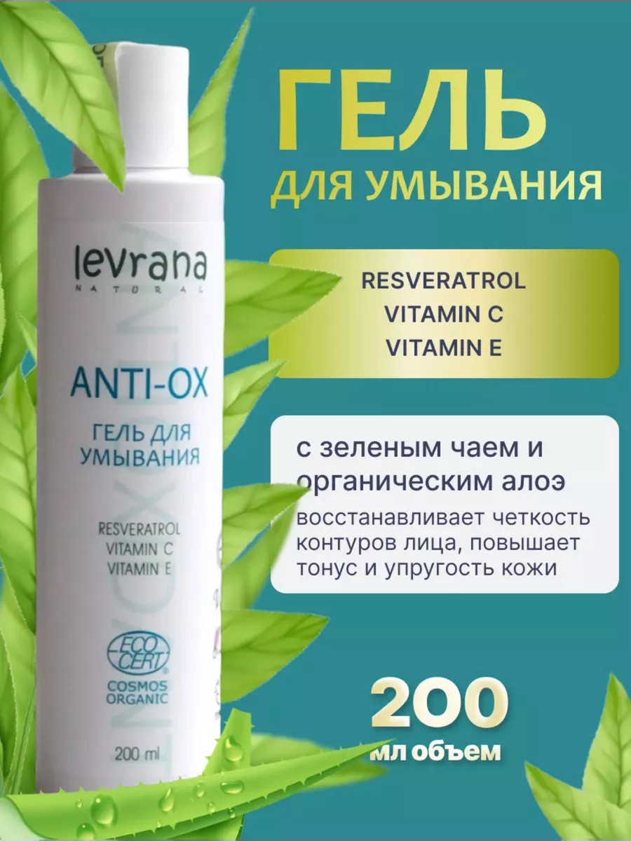 Гель для умывания с RESVERATROL, витаминами С и Е LEVRANA ANTI - OX, 200 мл предназначен для очищения кожи лица от различных загрязнений, макияжа с лица и шеи, глаз и губ, а также от излишков кожного жира. Он обладает легкой текстурой и содержит специальные ингредиенты, которые помогают бороться с проблемами кожи и поддерживают ее здоровое состояние. Гель подходит для всех типов кожи. Он особенно полезен для сухой, чувствительной и зрелой кожи, так как обладает увлажняющими, успокаивающими и антиоксидантными свойствами. Также может быть эффективным средством для жирной и проблемной кожи, так как содержит ингредиенты, которые помогают сужать поры, уменьшать воспаление и улучшать текстуру кожи. Он не вызывает ощущение стянутости и не пересушивает кожу. Уникальный состав геля обеспечивает комплексный уход за кожей. Он содержит экстракт алоэ вера, который увлажняет и успокаивает кожу, делая ее мягкой и гладкой. Мягкое ПАВ обеспечивает нежное очищение без пересушивания кожи. Зеленый чай, богатый антиоксидантами, помогает бороться с вредными воздействиями окружающей среды и предотвращает преждевременное старение кожи. Витамин C помогает выравнивать тон кожи и осветляет пигментные пятна. Ресвератрол, известный своими противовоспалительными свойствами, успокаивает кожу и уменьшает покраснения. Витамин E защищает кожу от воздействия свободных радикалов и помогает восстанавливать ее структуру. Экстракты гамамелиса и плюща, каштана и хмеля, а также арники оказывают антибактериальное и противовоспалительное действие, улучшают кровообращение и способствуют заживлению мелких ранок и ссадин. Он идеально подойдет для женщин и мужчин, а также для девушек подростков. Можно использовать утром и вечером. Уходовая косметика леврана без сульфатов и парабенов, а также не тестируется на животных. Органическая косметика отлично подойдет на подарок жене и маме, подруге и девушке, а также для любимого мужчины. Станет полезным подарком на день рождения, 8 марта и новый год.