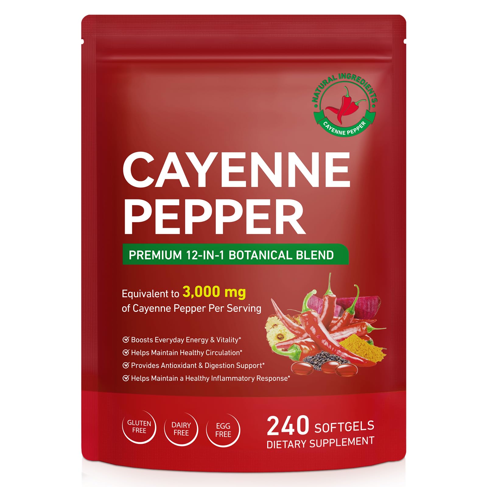 leyosger Cayenne Pepper Softgels Supplement 3000mg | 240 Softgels Dietary Supplement with 12-in-1 Herbal Blend Vitamin D3+K2 Grape Seed Hawthorn | Supports Circulation Energy & Digestion