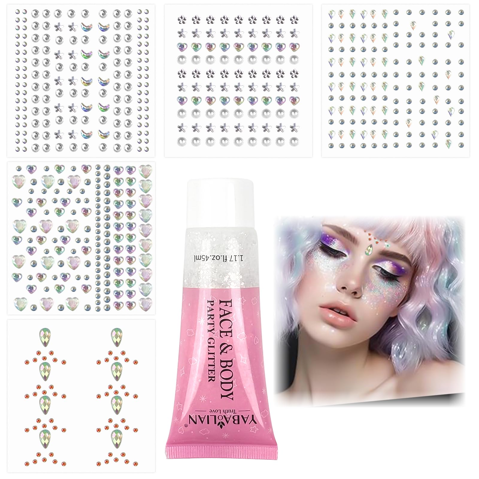 Ideal for musical events: Whether you're going to a concert, music festival, or party, these sparkling face stones add a captivating and glamorous look to your makeup. They're designed to attract attention and make you shine like a star. These rhinestone face stones are the perfect accessory to enhance your makeup at musical events or parties and add a touch of allure and elegance. Multi-use: You can use them with a little glitter gel on other parts of your face and body. Ideal for the face, body, eyes, lips, cheeks, hair, nail art, and more. Excellent accessories for singer concerts, music festivals, raves, music festivals, weddings, parties, parades, football tailgate parties, and stages worldwide. Safe and easy to use: The body glitter is made of high-quality holographic glitter, which is safe and long-lasting. Easy to use, no glue needed, you can use it to decorate your face or body directly and comfortably. It comes with an adhesive pen each diamond is separate and can be easily removed and applied with tweezers. These face and hair rhinestones have an easy-to-use self-adhesive design, making them simple to apply. Just peel and gently press onto the desired areas for stunning, sparkling makeup. Sparkling color: This glitter body gel contains small stars, dots, and hexagonal sequins that make your look more dazzling and eye-catching. The color and shine of the laser-cut sequins change depending on the viewing angle, allowing you to stand out from the crowd. Package contents: You will receive 1 white glitter body gel and 617 colorful self-adhesive rhinestones for face and hair, sparkling and beautiful, which can make you more charming and exceptional.Lot de 617 pierres strass autocollantes pour le visage et 45 ml de gel pailleté pour le visage, festival, fête, maquillage du visage, corps, ongles, lèvres (blanc)Idéal pour les événements musicaux : que vous alliez à un concert, à un festival de musique ou à une fête, ces pierres pour le visage scintillantes ajoutent un look captivant et glamour à votre maquillage. Elles sont conçues pour attirer l'attention et vous faire briller comme une étoile. Ces pierres pour le visage avec strass sont l'accessoire parfait pour améliorer votre maquillage lors d'événements musicaux ou de fêtes et ajouter une touche d'attrait et d'élégance. Multi-usage : vous pouvez l'utiliser avec un peu de gel pailleté sur d'autres parties de votre visage et de votre corps. Idéal pour le visage, le corps, les yeux, les lèvres, les joues, les cheveux, le nail art, etc. Excellents accessoires pour les concerts de chanteurs, les festivals de musique, les raves, les festivals de musique, les mariages, les fêtes, les défilés, les fêtes sur le hayon de football et les scènes du monde entier. Utilisation sûre et facile : les paillettes pour le corps sont fabriquées en paillettes holographiques de haute qualité, sûres et durables. Facile à utiliser, pas besoin de colle, vous pouvez l'utiliser pour décorer votre visage ou votre corps directement et confortablement. Il a un stylo de colle, chaque diamant est séparé et peut être facilement retiré et maquillé avec une pince. Ces pierres pour le visage et les cheveux ont un design autocollant facile à utiliser, ce qui les rend faciles à appliquer. Il suffit de peler et d'appuyer doucement sur les zones souhaitées pour obtenir un maquillage époustouflant et étincelant. Couleur scintillante : ce gel à paillettes pour le corps contient de petites étoiles, de petits points et des paillettes hexagonales qui rendent votre look plus scintillant et accrocheur. La couleur et la brillance des paillettes laser changent selon différents angles de vue, ce qui vous permet de vous démarquer de la foule. Contenu de la livraison : vous recevrez 1 gel blanc à paillettes pour le corps, 617 strass autocollants colorés pour le visage et les cheveux, étincelants et magnifiques, ce qui peut vous rendre plus charmant et exceptionnel.