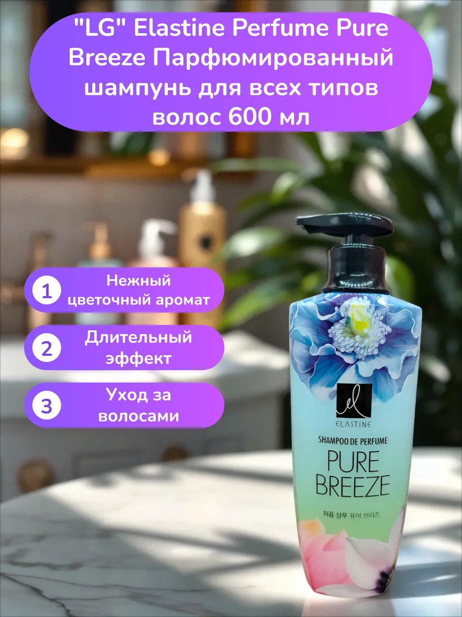 Парфюмированный шампунь Pure Breeze серии Elastine корейского концерна LG Household & Health для восстановления упругости волос – это забота и романтический флер влюбленности в каждой капле. Аромат шампуня имеет фруктовые и цветочные ноты герани, белого чая, ландыша, водной лилии, кедра, мускуса, розы и свежего лесного цветения.