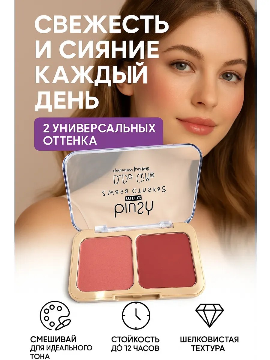 Румяна в удобной двойной палетке — это универсальное средство для макияжа, которое подойдёт как для дневного, так и для вечернего образа. Два гармоничных оттенка позволяют подобрать тон под настроение, смешивать их для получения идеального результата или использовать по отдельности. Текстура продукта лёгкая, шелковистая и хорошо пигментированная: румяна легко набираются на кисть, равномерно распределяются и мягко растушёвываются, создавая эффект натурального румянца.