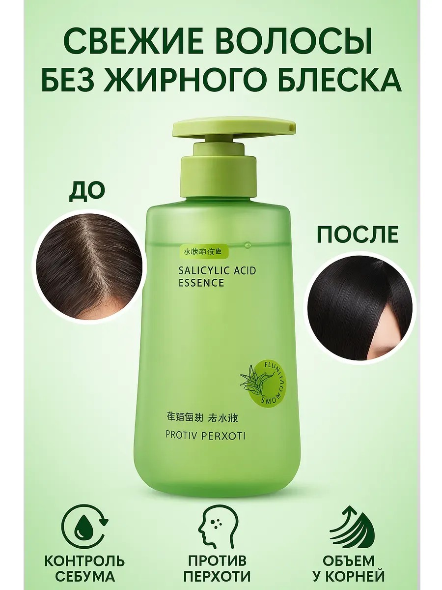 Шампунь с салициловой кислотой — это настоящая находка для тех, кто устал бороться с жирными волосами, отсутствием объема и постоянным ощущением неухоженности уже на следующий день после мытья головы. Если вы знаете, что такое быстрое засаливание корней, зуд кожи головы и тусклость, то этот освежающий шампунь с глубоким очищением станет вашим незаменимым помощником. Его уникальная формула с салициловой кислотой и активными ухаживающими компонентами глубоко очищает кожу головы от излишков кожного сала, устраняет перхоть, препятствует закупорке пор и надолго сохраняет ощущение свежести. Средство не только контролирует жирность, но и бережно ухаживает за волосами по всей длине. После мытья волосы становятся легкими, воздушными, обретают объем у корней и естественный блеск. В отличие от обычных шампуней, которые лишь временно убирают жирный блеск, формула с салициловой кислотой работает на клеточном уровне, нормализует работу сальных желез и способствует восстановлению здорового баланса кожи головы. Если вы хотите реже мыть голову и при этом выглядеть ухоженно каждый день, шампунь для жирных волос с салициловой кислотой — идеальное решение. Он подходит как женщинам, так и мужчинам, независимо от типа волос. Особенно эффективен для склонных к жирности и комбинированных типов кожи головы. Еще одно преимущество — эффект лёгкого пилинга. Благодаря этому шампунь мягко удаляет ороговевшие клетки, стимулирует рост новых здоровых волос и предотвращает появление зуда и дискомфорта. Регулярное использование делает волосы пышными, гладкими и послушными, облегчает укладку и придает им естественный объем без утяжеления.