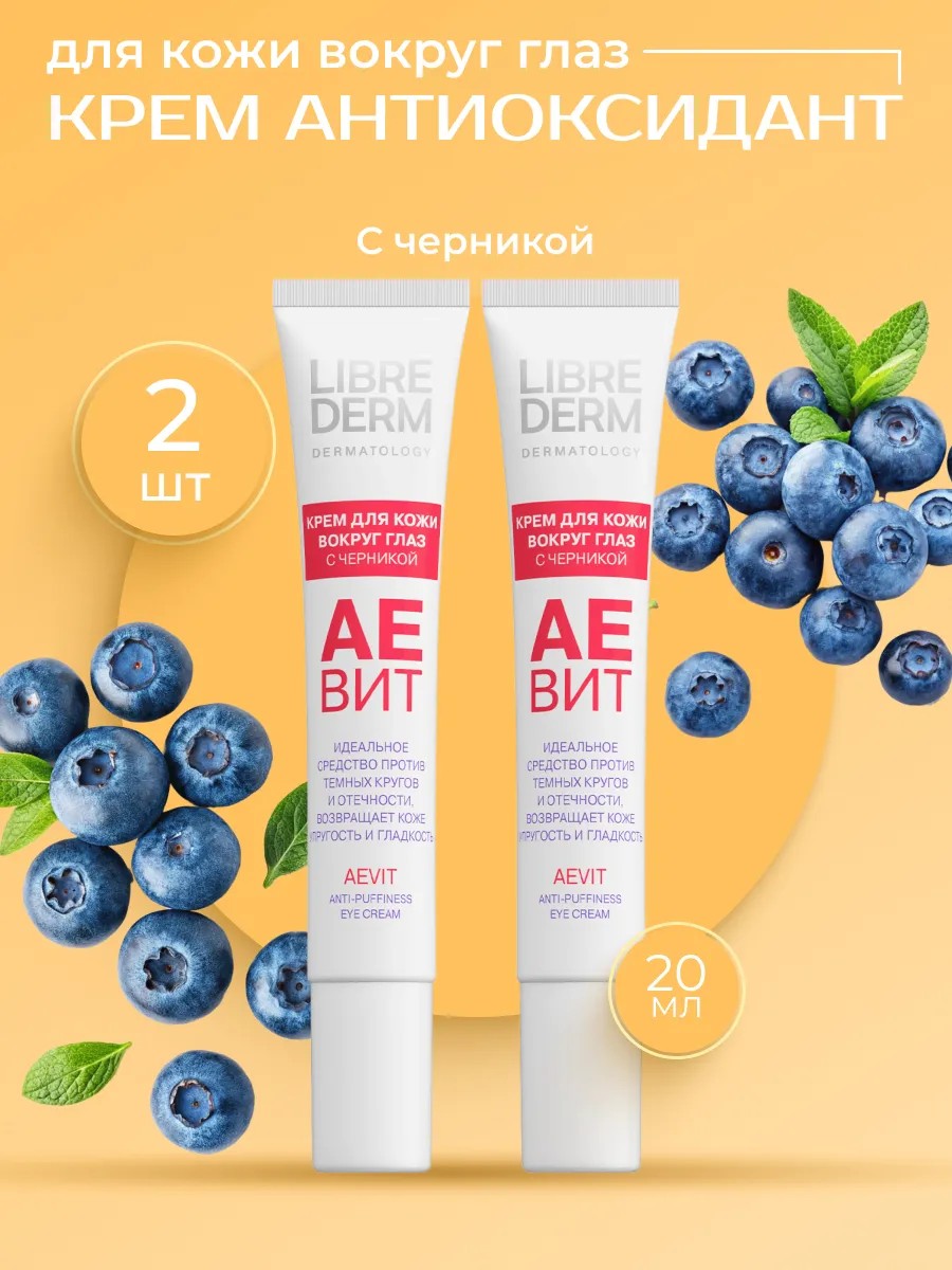 АЕВИТ крем с черникой против отеков для кожи вокруг глаз 20 мл 2 шт. Нежный увлажняющий крем AEVit с черникой предназначен для комплексного ухода за тонкой кожей вокруг глаз: избавляет от мешков и темных кругов под глазами, питает и защищает кожу. Питательный крем помогает в борьбе против морщин и синяков вокруг глаз и делает кожу упругой. Витамины А и Е в синергии восстанавливают эластичность кожи, ускоряют процессы регенерации и обновления клеток, защищают клетки от старения, обеспечивают мощное антиоксидантное воздействие. Экстракт черники богат витаминами А,В1,В2,С,РР и микроэлементами, благодаря чему питает и успокаивает нежную кожу вокруг глаз. Омолаживающий крем с пептидами протеина сои и гидролизованного рисового протеина борется против отеков и предупреждает появление морщин и дряблость кожи. Способ применения: небольшое количество крема наносить на чистую кожу вокруг глаз легкими похлопывающими движениями подушечек пальцев утром и вечером за 1,5 - 2 часа до сна. C уважением и заботой, Ваш Librederm / Либридерм / либридерм