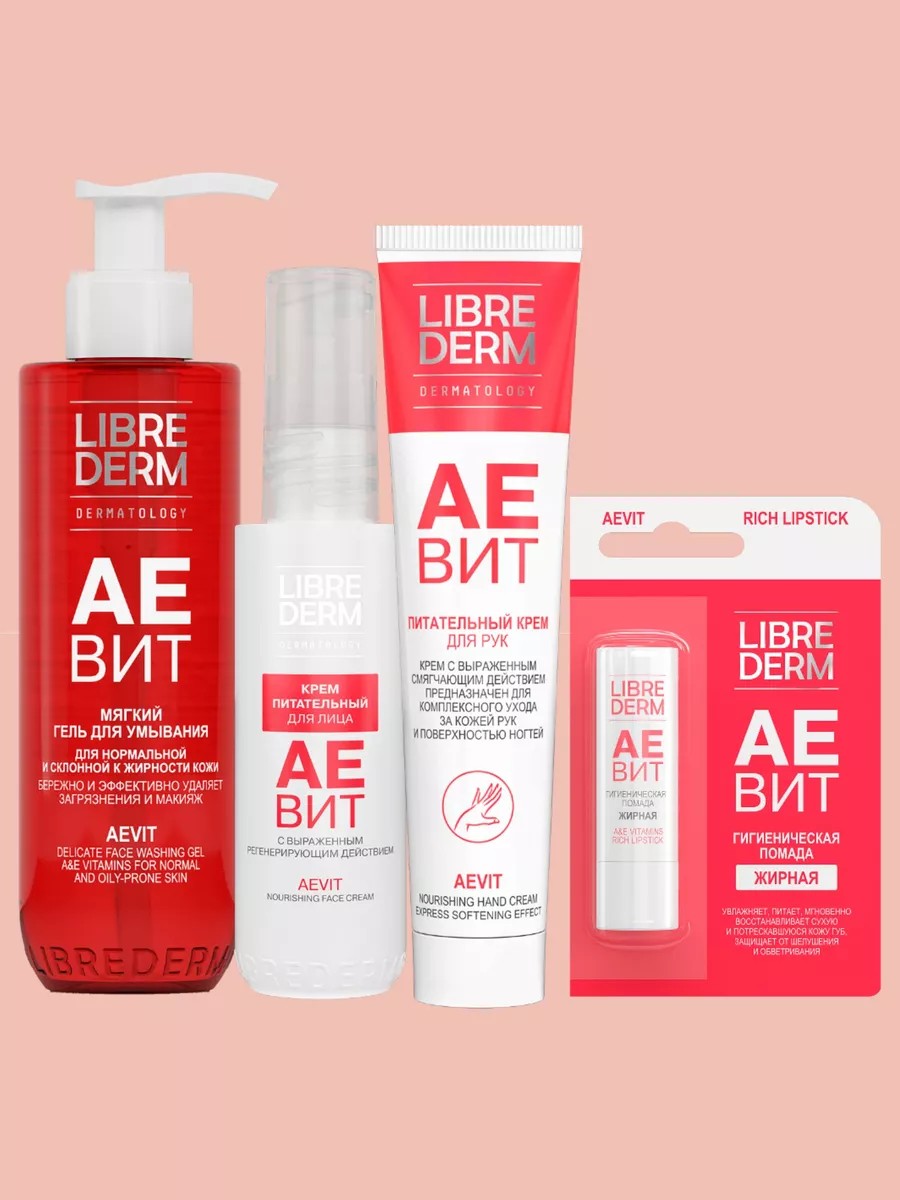 ЛИБРИДЕРМ АЕВИТ ГЕЛЬ МЯГКИЙ Д/УМЫВАНИЯ 200МЛ+ЛИБРИДЕРМ АЕВИТ КРЕМ Д/ЛИЦА 50МЛ+ЛИБРИДЕРМ АЕВИТ КРЕМ Д/РУК 125МЛ+ЛИБРИДЕРМ АЕВИТ ПОМАДА ГИГИЕН ГУБНАЯ ЖИРНАЯ 4,0