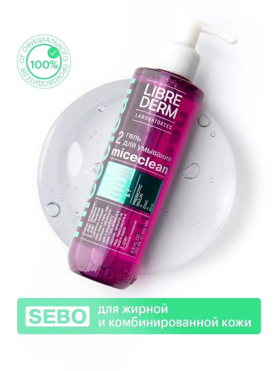 LIBREDERM Либридерм MICECLEAN SEBO гель для умывания для жирной и комбинированной кожи 200 мл тщательно очищает кожу лица, эффективно удаляя загрязнения и омертвевшие клетки, готовит кожу к нанесению средств основного ухода. Не оставляет ощущения сухости, нормализует выделение себума и микробиоту кожи. Предназначен для ежедневного ухода за кожей любого типа, особенно подходит для комбинированной и склонной к жирности кожи. Входящий в состав цинк регулирует выработку себума, уменьшает жирный блеск, придавая коже ощущение свежести и матовый тон. Инулин - мощный пребиотик, нормализует и поддерживает баланс здоровой микробиоты кожи. Салициловая кислота способствует очищению кожи от отмерших клеток и излишнего себума. Как результат - чистая бархатная кожа без лишнего блеска и ощущения стянутости.Способ применения: небольшое количество геля вспеньте в ладонях, нанесите на лицо, избегая области вокруг глаз. После применения тщательно смойте водой.