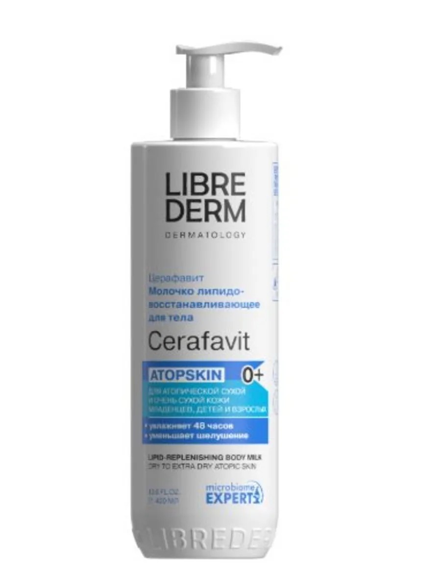 Librederm церафавит молочко для сухой и очень сухой кожи младенцев детей и взрослых с церамидами и пребиотиком - средство содержит комбинацию активных ингредиентов для восстановления защитной функции кожи, а также для улучшения увлажненности, уменьшения чувствительности и сухости. Пребиотик обладает уникальным свойством избирательно стимулировать рост и метаболическую активность "хороших" микроорганизмов, тем самым поддерживая гармоничный баланс микробиоты свойственный здоровой коже. Витамин F - это комплекс полиненасыщенных жирных кислот, играет важную роль в обеспечении барьерной функции кожи, способствует быстрому восстановлению липидного барьера кожи. Увлажняющий комплекс натуральных сахаридов усиливает барьерную функцию, стимулирует синтез церамидов, оптимизируя гидролипидный баланс. Масло ши питает, увлажняет, смягчает кожу, успокаивая и защищая ее, способствует ее восстановлению. Средство предназначено для ухода за сухой, атопической, склонной к шелушению и раздражению кожей взрослых и детей с первых дней жизни. Наносить на чистую сухую кожу утром и вечером. Подходит для ежедневного применения. При появлении каких-либо раздражений или аллергических реакций немедленно прекратить использование.