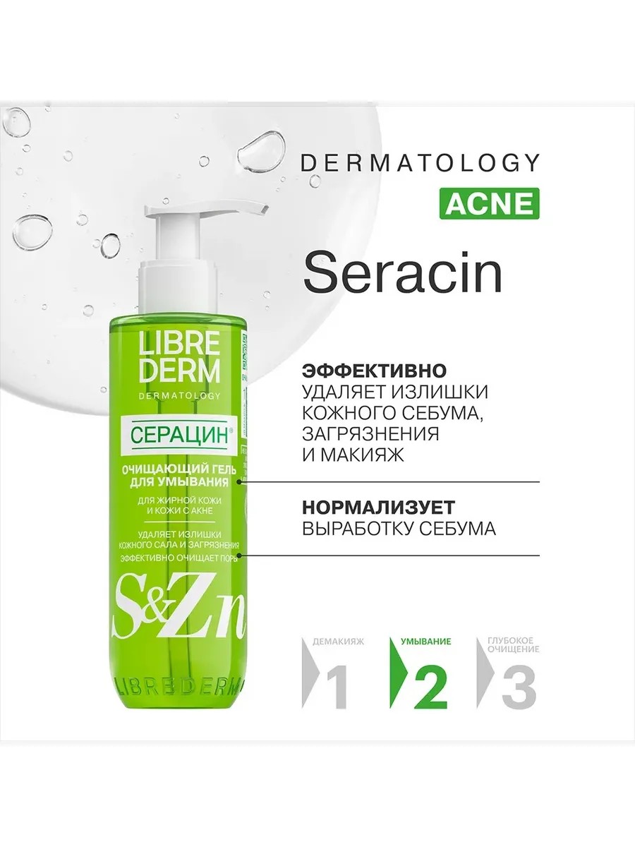 Librederm Серацин (Seracin) очищающий гель для умывания - эффективно очищает кожу, удаляя загрязнения и контролируя выработку себума. Благодаря сочетанию серы, цинка PCA и гликолевой кислоты, гель оказывает антибактериальное действие, предотвращает появление акне и способствует обновлению кожи. Натуральный увлажняющий комплекс поддерживает необходимый уровень гидратации, обеспечивая коже свежесть и комфорт без сухости. Идеален для ухода за жирной и проблемной кожей. Дерматологически протестировано. Гипоаллергенная отдушка. Объём флакона 200 мл