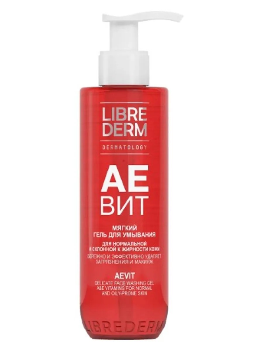 ЛИБРИДЕРМ АЕВИТ ГЕЛЬ МЯГКИЙ Д/УМЫВАНИЯ 200МЛ. Антиоксидантное, ускоряет процессы регенерации, восстанавливает эластичность кожи. Гель для умывания для нормальной и склонной к жирности кожи aqua, cocamidopropyl betaine, sodium laureth sulfate, disodium laureth sulfosuccinate, cocamide mipa, laureth-4, allantoin, aloe barbadensis leaf juice, retinyl palmitate, panthenol, tocopheryl acetate, sodium chloride, peg-40 hydrogenated castor oil, parfum, sodium hydroxide, methylchloroisothiazolinone, methylisothiazolinone. Бренд LIBREDERM (Либридерм) - решения для любой дерматологической потребности.Линия Витамины АЕВИТ [Vitamins AEVIT] - Интенсивное питание и увлажнение - базовые потребности любого типа кожи, в том числе склонной к жирности.Коллекция АЕВИТ насыщает кожу витаминами, увлажняет и питает её. Синергитическое сочетание витаминов А и Е обеспечивает мощное антиоксидантное воздействие, защищает клетки от повреждений, ускоряет процессы регенерации. Витамин А снижает общий уровень жирности комбинированной кожи.ЛИБРИДЕРМ АЕВИТ ГЕЛЬ МЯГКИЙ Д/УМЫВАНИЯ - для нормальной и комбинированной кожи.Внешний вид и свойства: Гель обладает кремовой, нежной структурой, хорошо пенится и легко смывается водой, оставляя на коже приятный аромат.Возраст с 20 летМягкий гель для умывания специально разработан для очищения нормальной и склонной к жирности кожи.Бережно и эффективно удаляет загрязнения и макияж, не оставляя ощущения стянутости и сухости.Содержит незаменимые для кожи витамины А и Е, которые питают, способствуют обновлению клеток кожи.Активные ингредиенты:-Мягкие очищающие компоненты - деликатно, без пересушивания очищают кожу от загрязнений и макияжа.-Синергия витаминов А (ретинол) и Е (токоферол) - обладает мощным антиоксидантным действием. Оберегает липидную мантию кожи от агрессивного воздействия внешней среды. Стимулирует обновление клеток, питает, поддерживает оптимальный водный баланс, замедляет появление видимых признаков фотостарения.-Аллантоин - успокаивает и увлажняет
