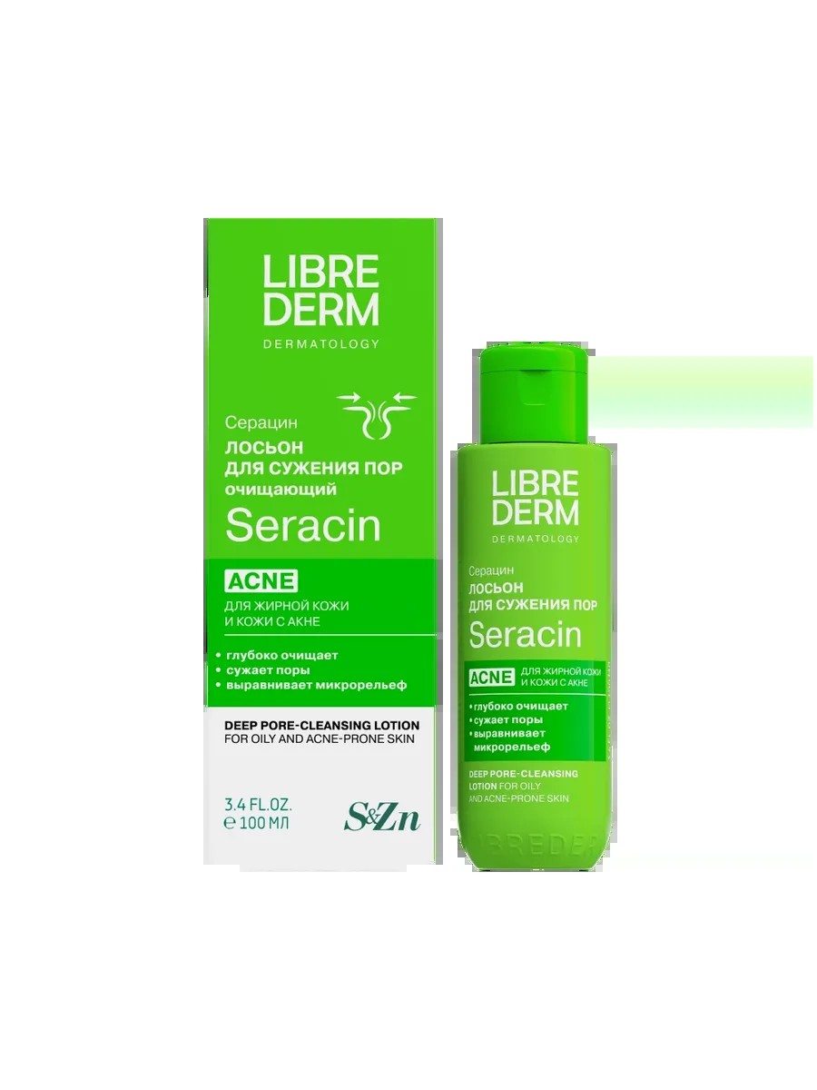 либридерм серацин лосьон д/глубокого очищения пор 100мл. лосьон предназначен для глубокого очищения жирной кожи лица от излишне выделенного себума (кожного сала) и ежедневных загрязнений,? избавляет от «черных точек», оказывает мягкое отшелушивающее действие, успокаивает кожу, придает ей здоровый вид, уход за кожей лица, подходит для жирной кожи и кожи с акне. aqua, sodium pca, microcitrus australasica fruit extract, polysorbate 80, sulphur, panthenol, sisymbrium officinale extract, arctium lappa root extract, citric acid, glycolic acid, zinc pca, sclerotium gum, niacinamide, calcium pantothenate,sodium ascorbyl phosphate, tocopheryl acetate, pyridoxine hcl, maltodextrin, sodium starch octenylsuccinate, silica, dehydroacetic acid, benzyl alcohol, glycerin, parfum, tetrasodium edta, sodium hydroxide. бренд librederm (либридерм)линия серацин [seracin] - широкая коллекция средств для комплексного ухода за жирной кожей и кожей, склонной к акне.librederm серацин лосьон для глубокого очищения пор - для жирной кожи и кожи с акневнешний вид и свойства: лосьон легко наносится и быстро впитывается, не оставляя следов.возрастная категория: с 20 леткомплекс с ана-кислотами в составе глубоко очищает и сужает поры.матирует и выравнивает рельеф кожи, устраняя несовершенства без пересушивания.активные ингредиенты:- экстракт пальчикового лайма богат ана-кислотами, которые бережно эксфолиируют отмершие клетки эпидермиса. кожа приобретает здоровый цвет, сияние и нежность.- балансирующий комплекс нового поколения (экстракты репейника и гулявника, гидроксикислоты и соль цинка) оказывает антисептическое, себорегулирующее, матирующее и очищающее действия.- пантенол (5 % провитамин в5) успокаивает кожу. контролирует воспалительные реакции и повышает защитные свойства кожи к воздействию раздражителей.- sodium pca- безопасный и эффективный природный увлажнитель, получаемый из аминокислот овощей.эффективность:глубоко очищает и сужает поры. бережно удаляет омертвевшие клетки эпидермиса, вырав