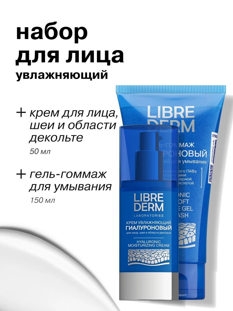 | Комплектация | LIBREDERM Гиалуроновый крем увлажняющий для лица, шеи и области декольте 50 мл; LIBREDERM Гиалуроновый гель-гоммаж для умывания ультрамягкий 150 мл |