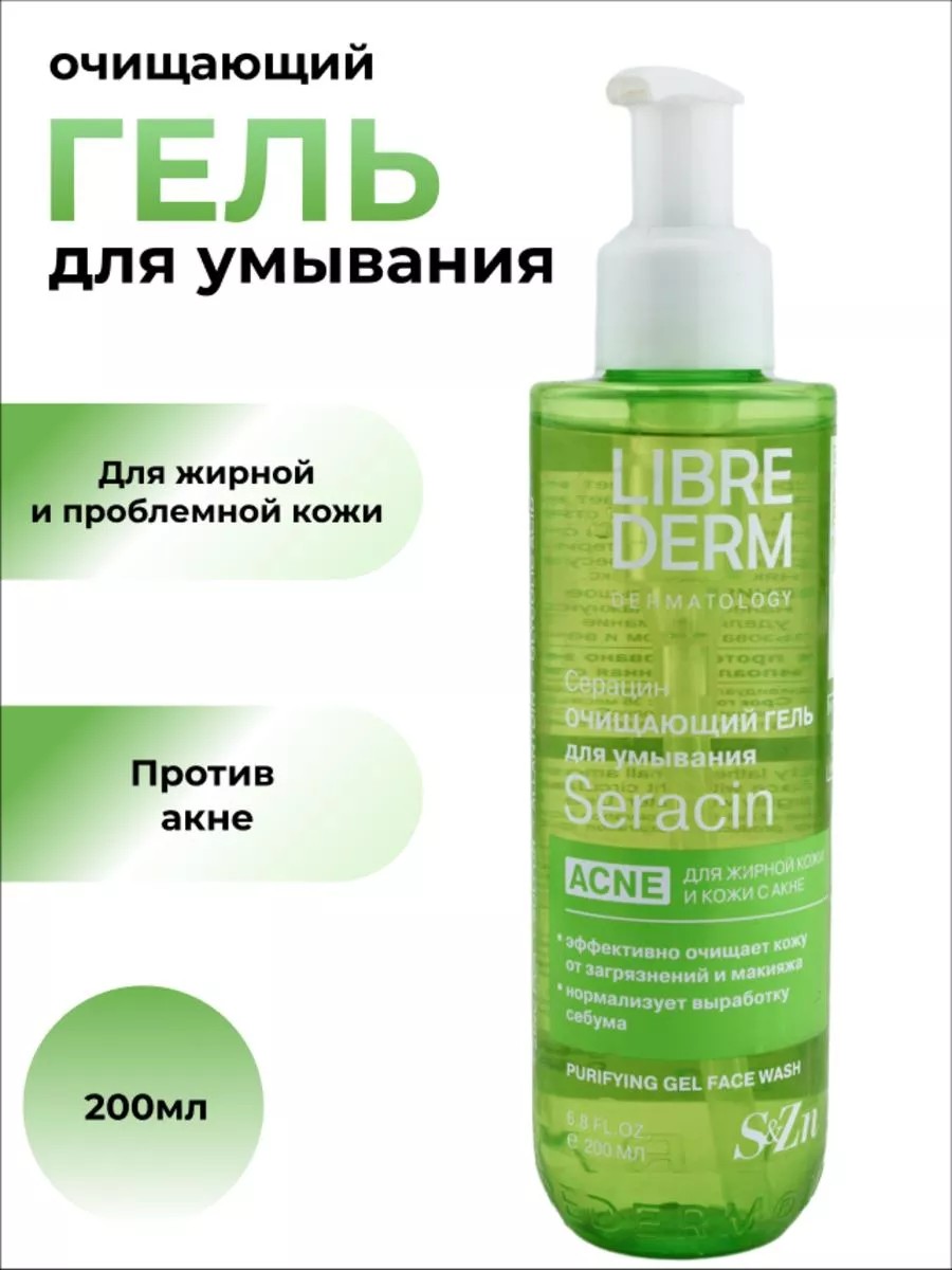 Librederm / Librederm Seracin Cleansing Gel Wash, 200 ml. Seracin Cleansing Gel Wash is designed for oily, problematic skin and effectively combats acne. It gently removes impurities and makeup, preparing the skin for skincare products. It does not dry or tighten. A new-generation balancing complex (burdock and burdock extracts, zinc) provides antiseptic, sebum-regulating, mattifying, and cleansing properties. This antibacterial cleansing gel is suitable for teenagers and helps eliminate pimples and blackheads. HOW TO USE: Lightly lather a small amount of gel in your palms, then apply to your face using light circular motions, focusing on the T-zone, and rinse thoroughly with water. Repeat if necessary.